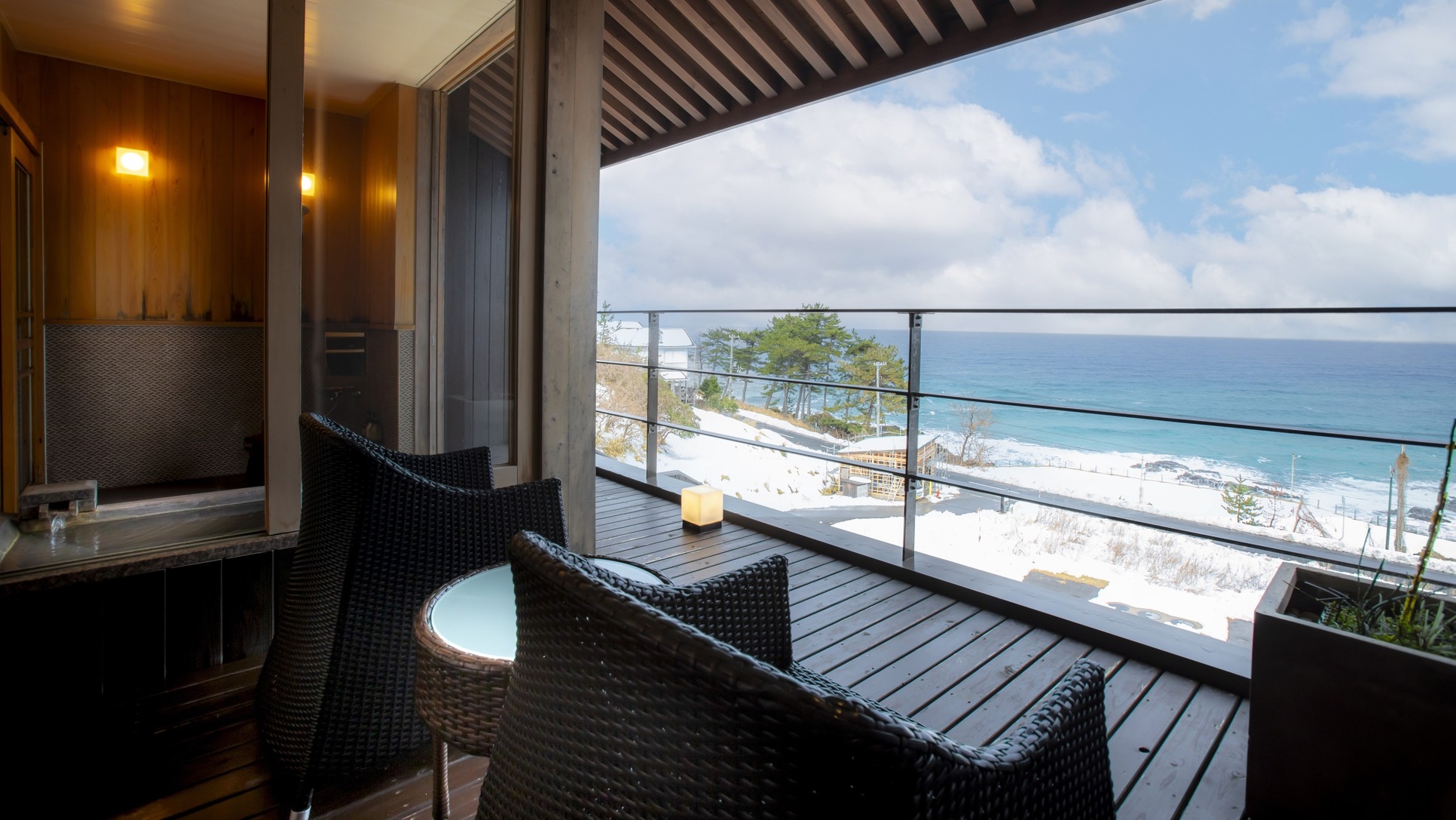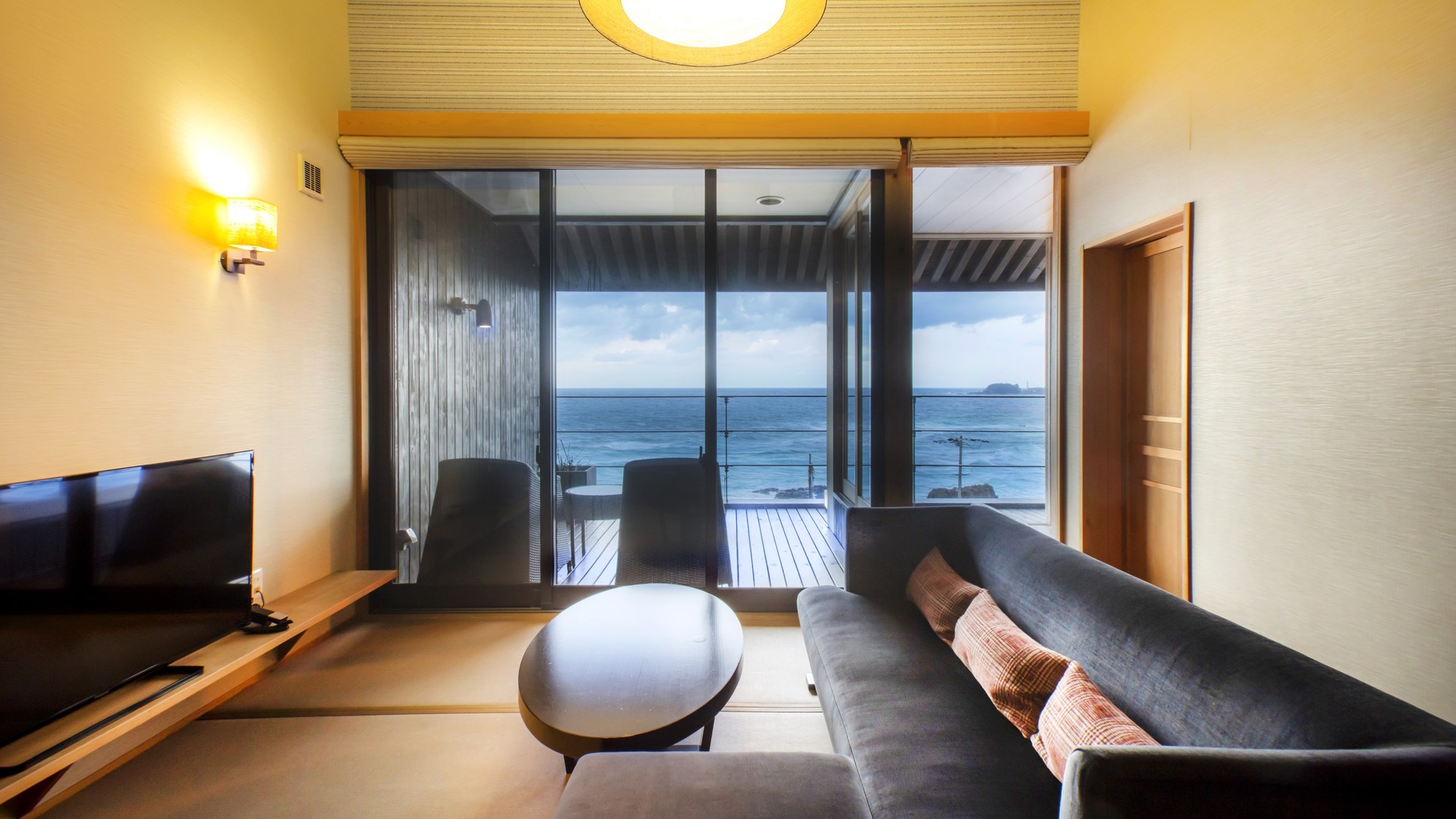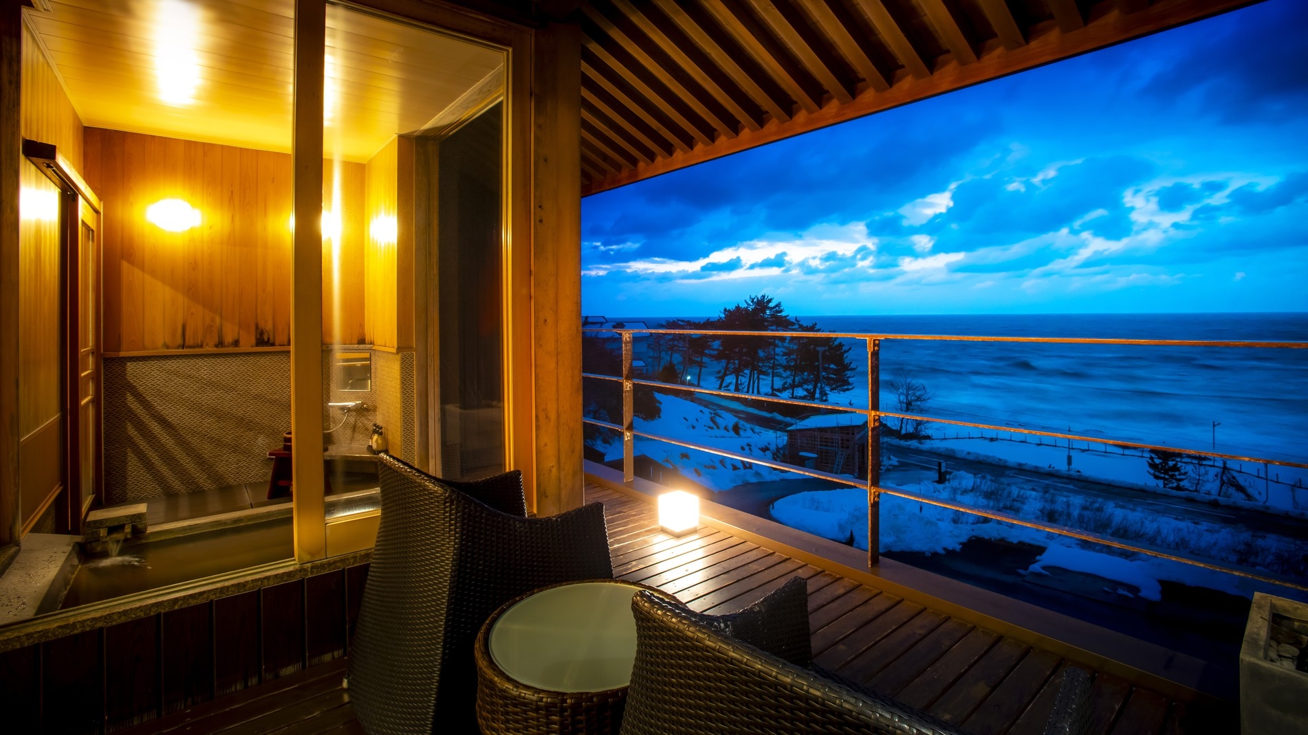 青を基調とした和モダンな設え。 日本海が一望できる露天風呂と専用のウッドデッキのテラス。 お洒落な家具に囲まれたリビング。占有面積43平米