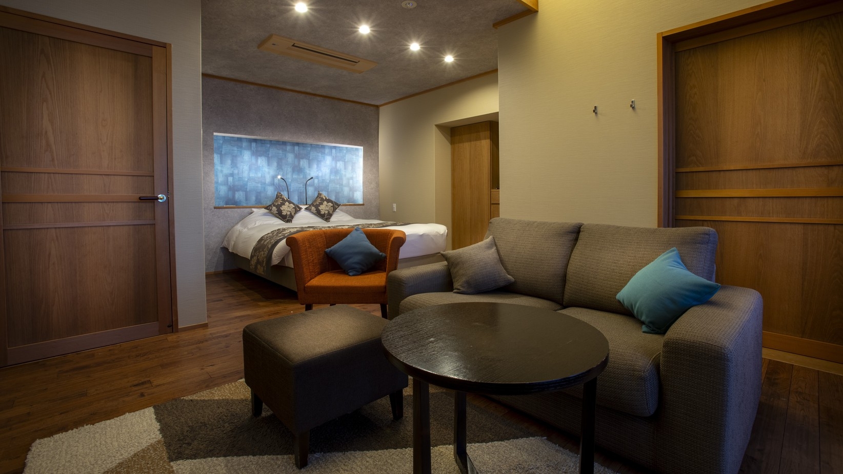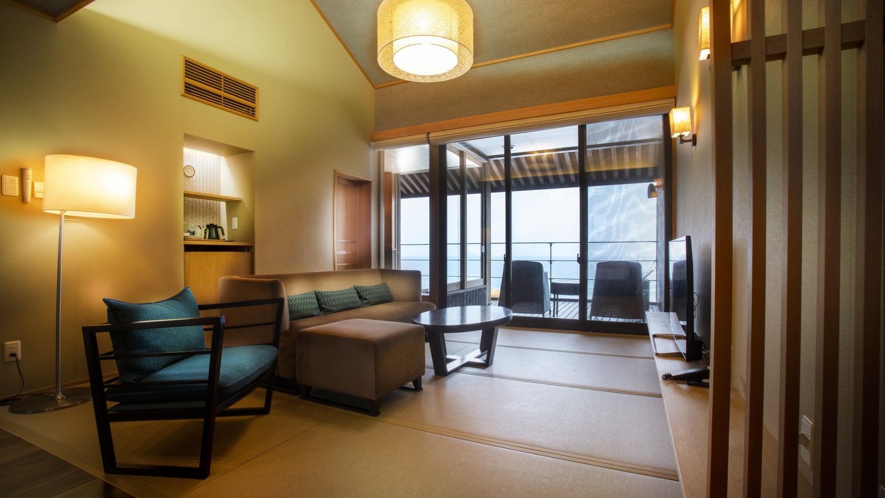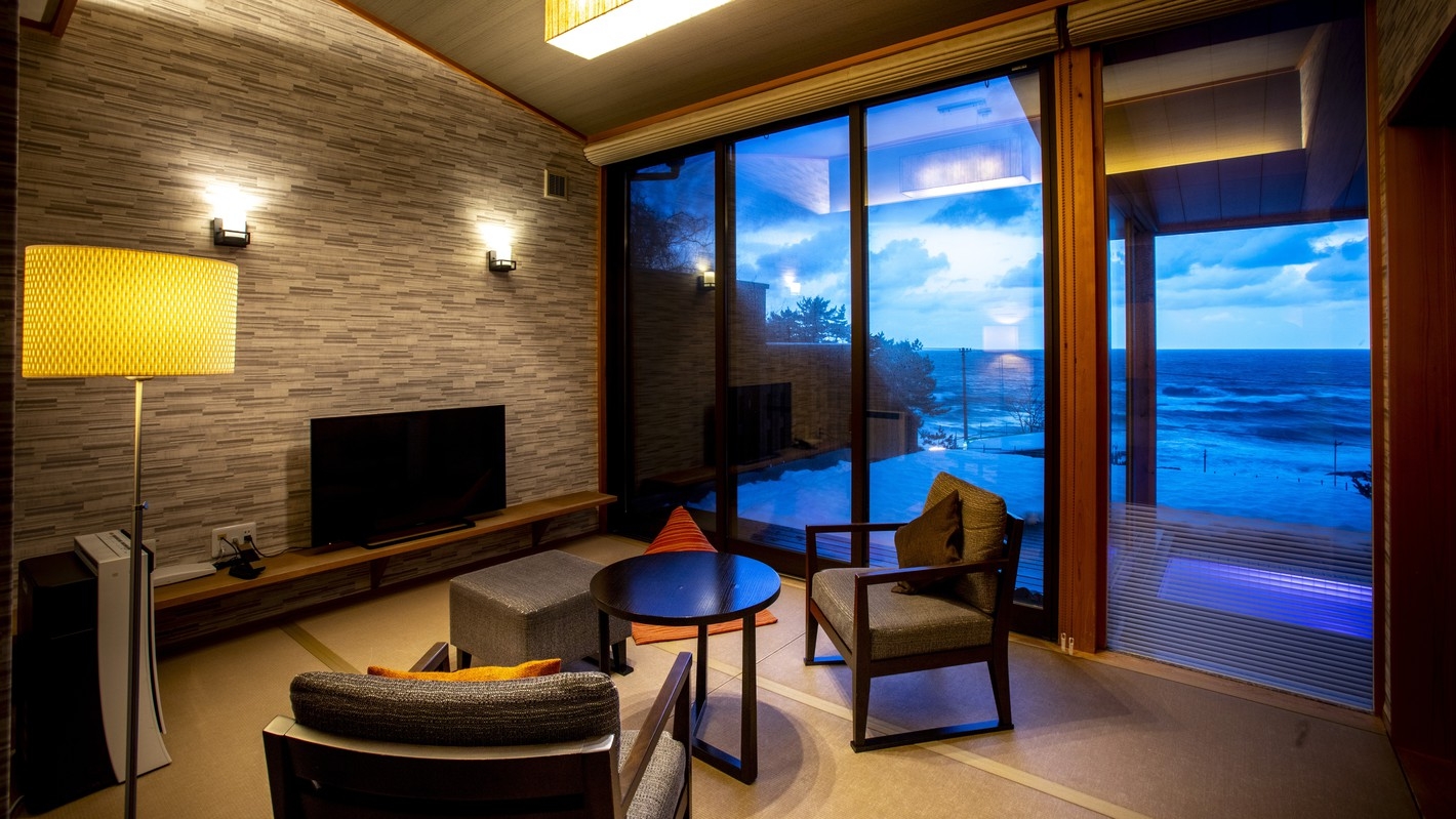 青を基調とした和モダンな設え。 日本海が一望できる露天風呂と専用のウッドデッキのテラス。 お洒落な家具に囲まれたリビング。占有面積43平米