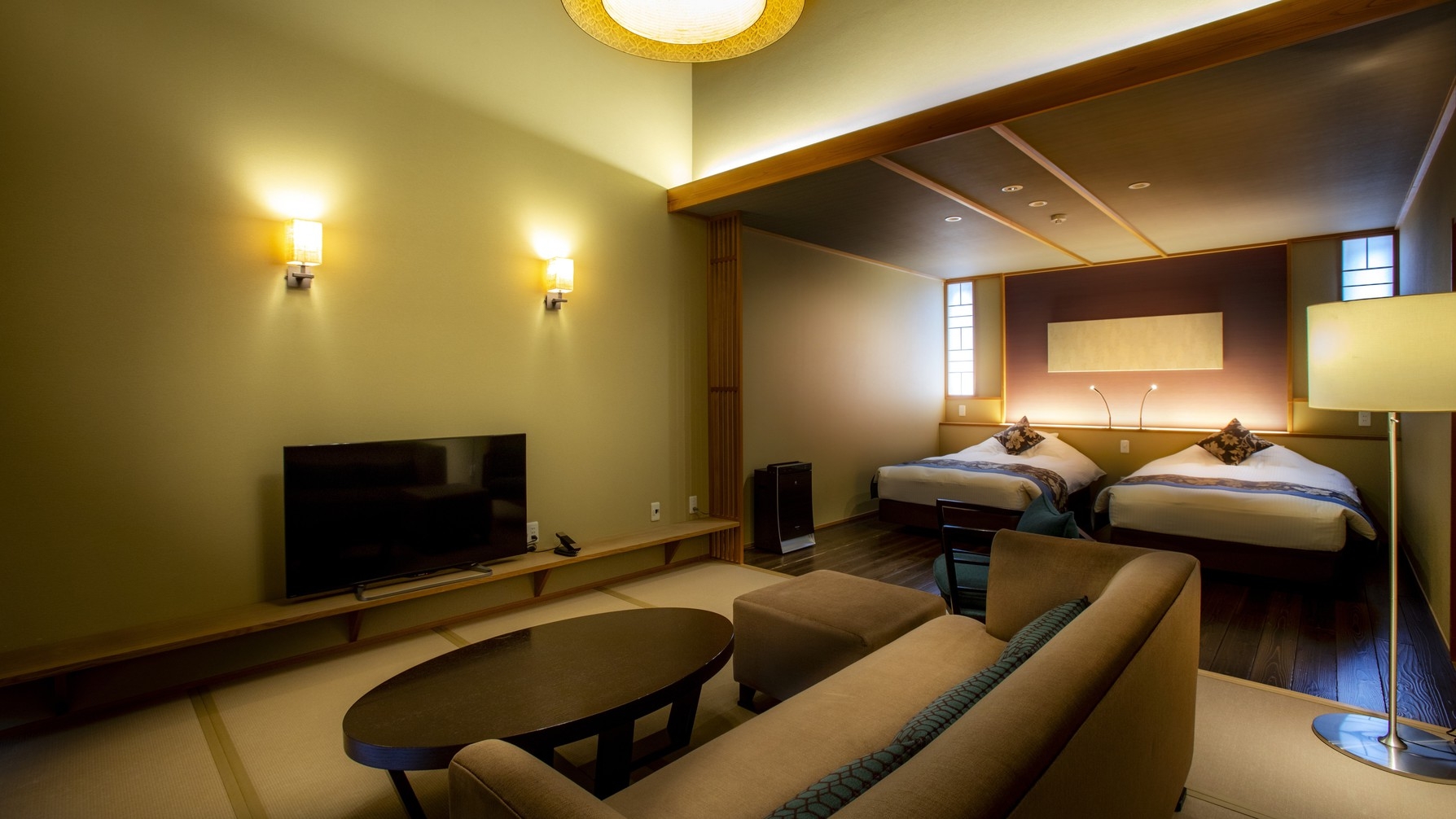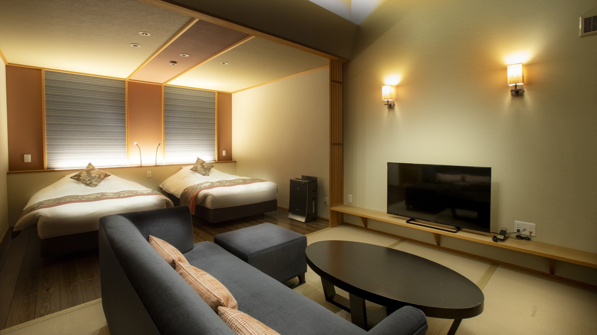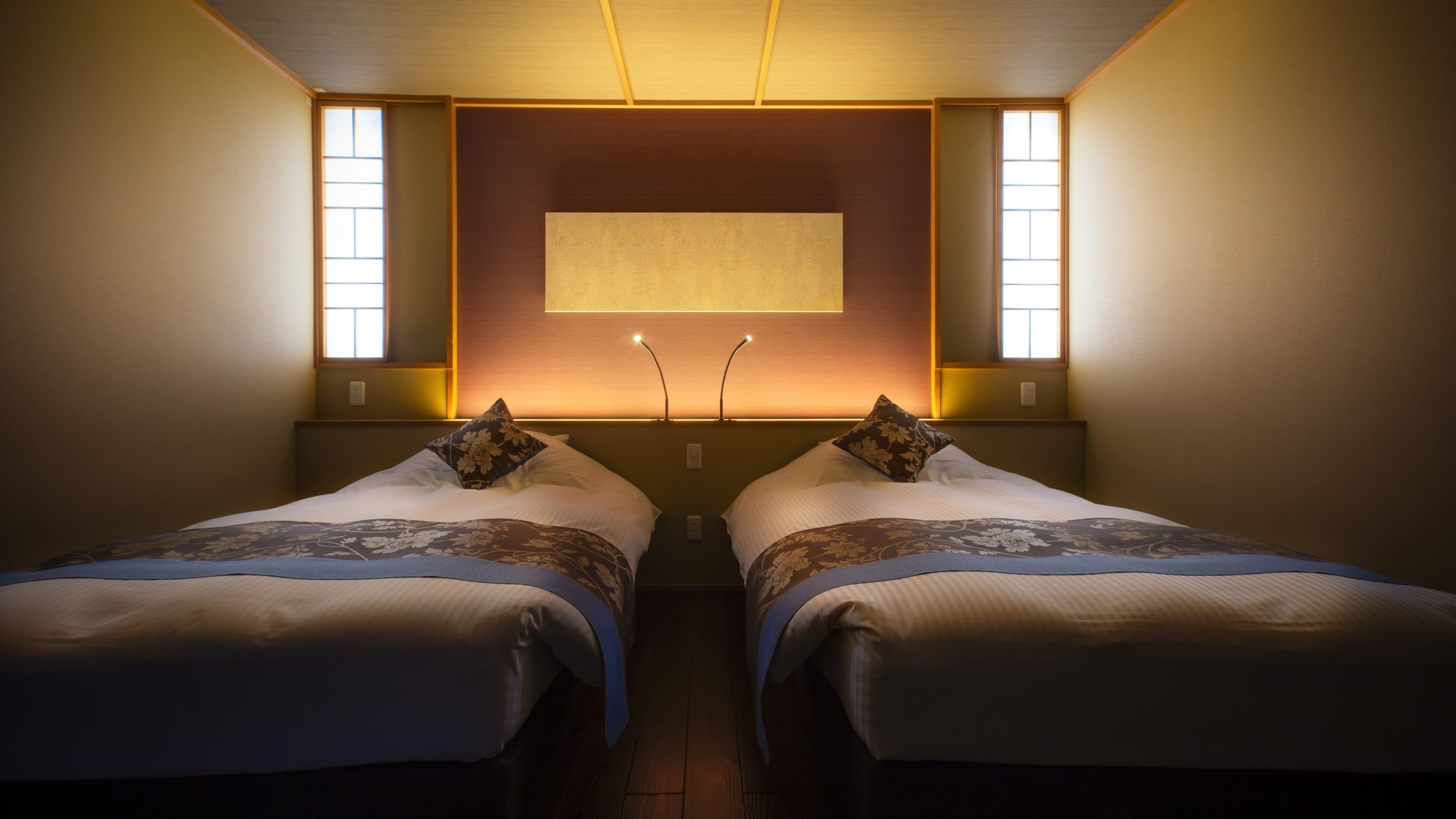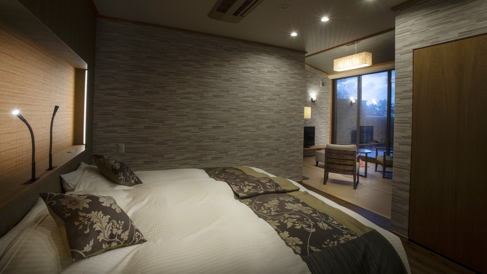 日本海が一望できる2階客室(階段あり)和モダンな設えで、専用の天然露天風呂と専用のウッドデッキのテラス。 セミナダブルのシモンズベット2台。占有面積 60平米