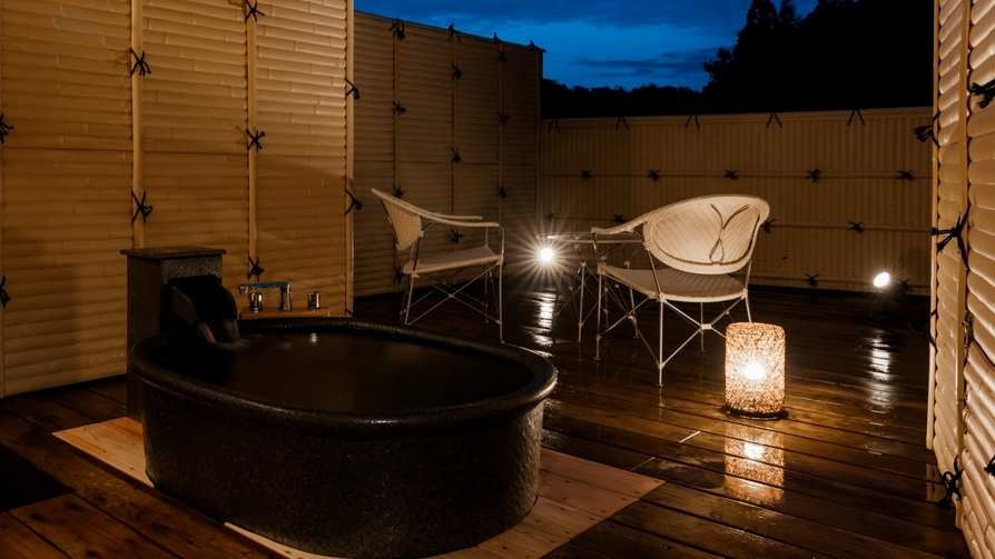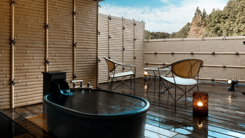 2025年10月より、趣ある信楽焼の陶器製露天風呂としてリニューアルオープンしました。シャワーブース、シモンズ社製ベッド2台を完備。
