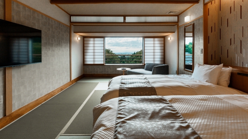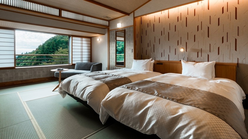 シモンズベッド2台+和室10畳 / ベッド幅140cm/55型/TV2台/Netflix/Youtube※露天風呂は温泉を引いております。