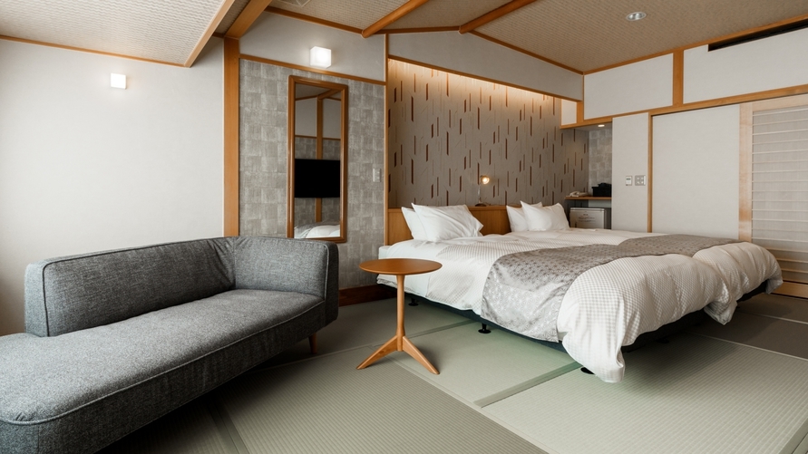 「TAKUMI-PREMIUM」は、広大な面積と匠の技が融合した、TAKUMIシリーズ最高峰の客室です。当館最大の広さを誇る空間内に、リビング、寝室、客室露天風呂を配置。3世代のご家族やグループでの滞在にも最適です。