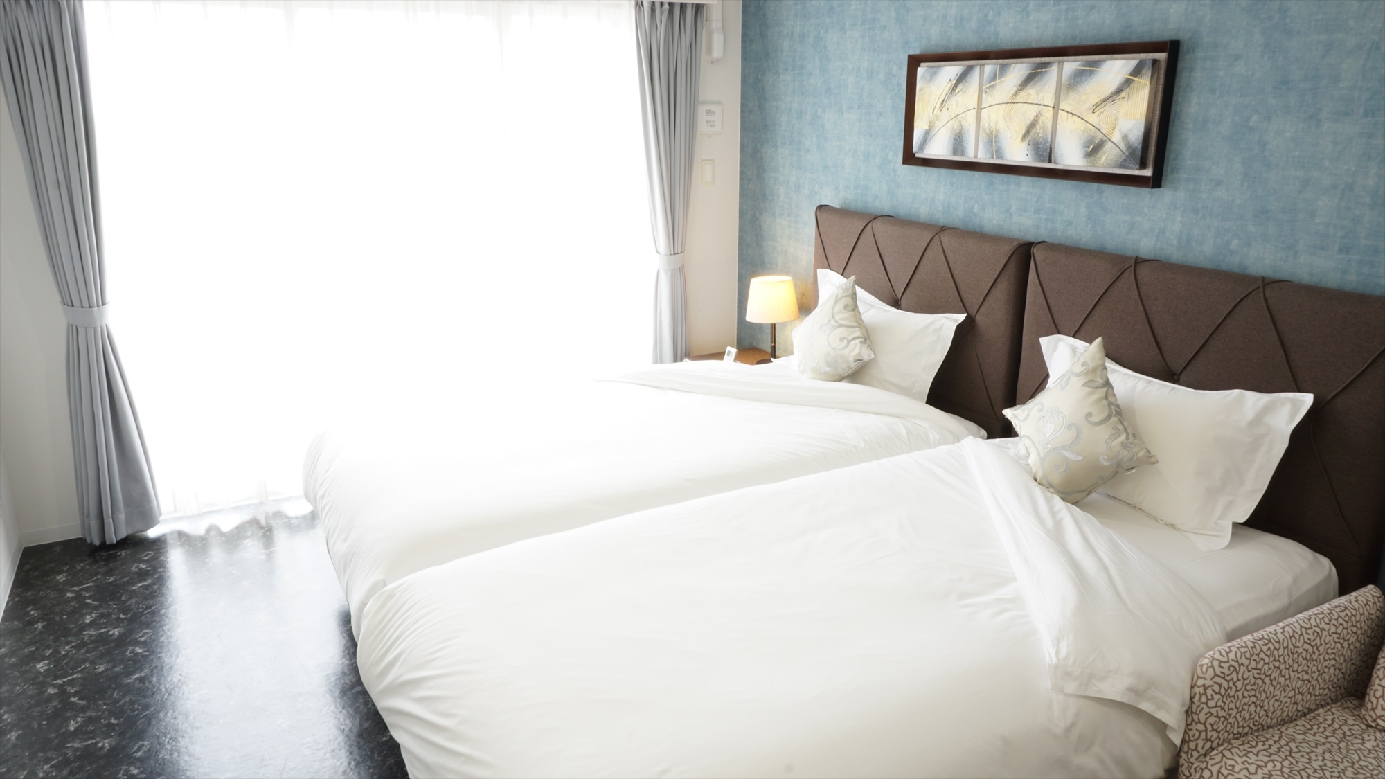 2台のベッドを寄せて並べた客室。小さなお子様連れでの添い寝も安心。キッチン、冷蔵庫、電子レンジ、洗濯機、乾燥機付、全室オーシャンビュー