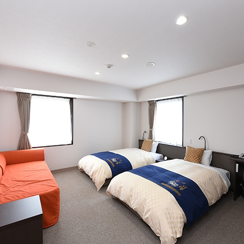 120cmベッド2台と和室を設置した、36〜45平米のお部屋。設備:TV・電話・ポット・冷蔵庫・お茶セット・ドライヤー・スリッパ・消臭剤・アメニティ