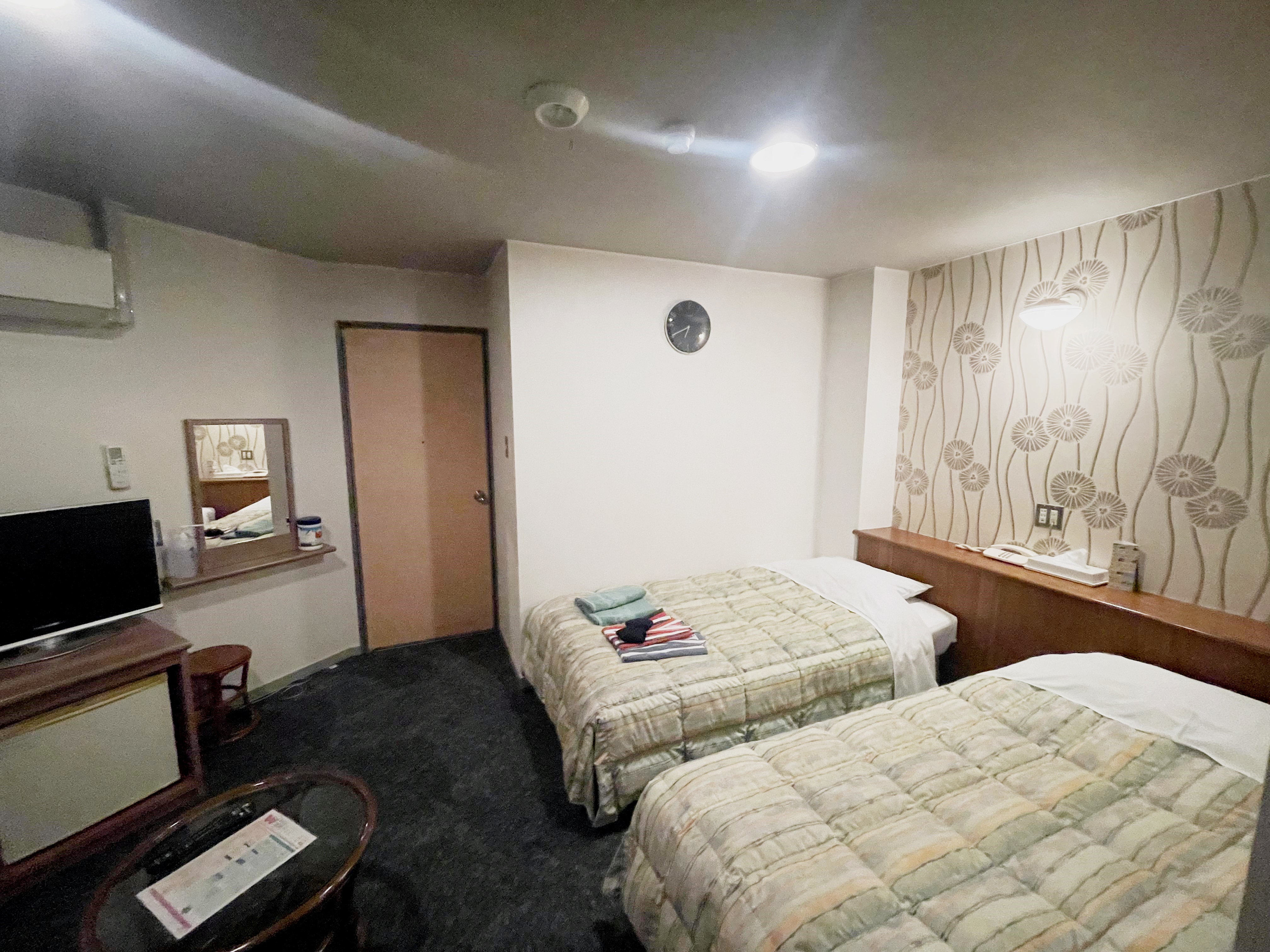 セミダブルベッドが二つ エキストラベッドになるソファが一つある当ホテルでは広めの洋室です 源泉を使用したユニットバス付き、FREE-WIFI