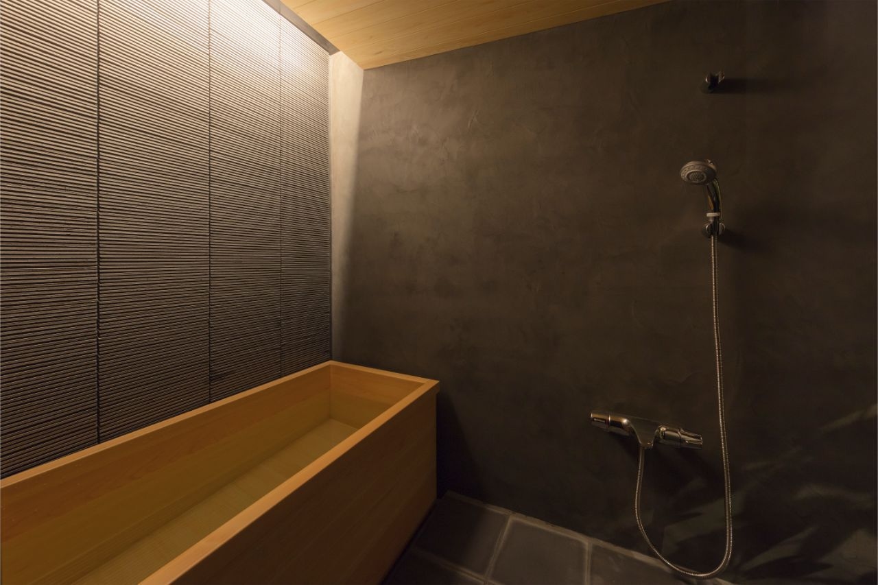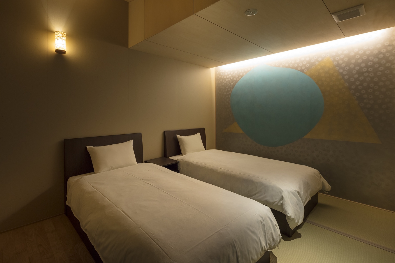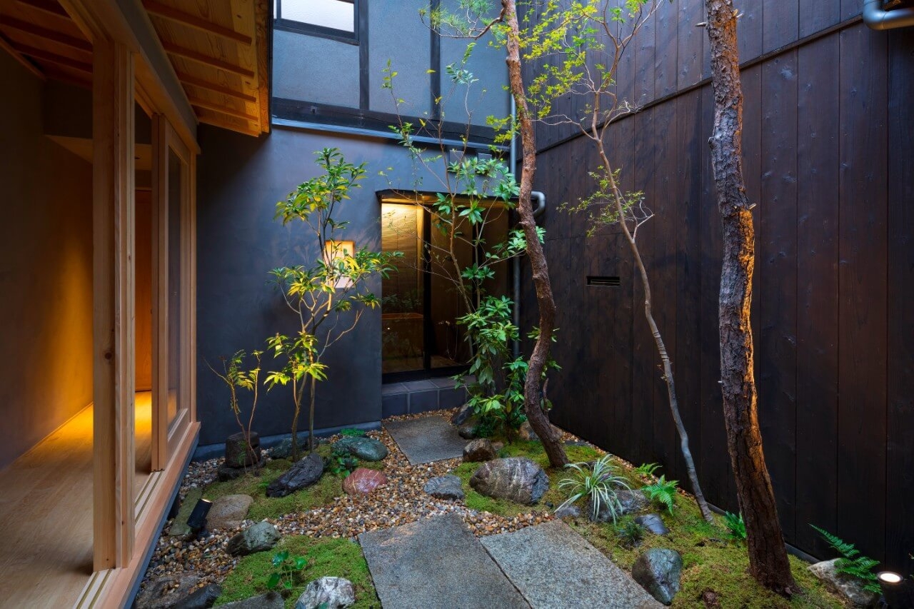 2階建て。布団6組、ベッド2台、和室x2、洋室、キッチン、トイレx2、洗面、浴室、シャワールーム、坪庭。