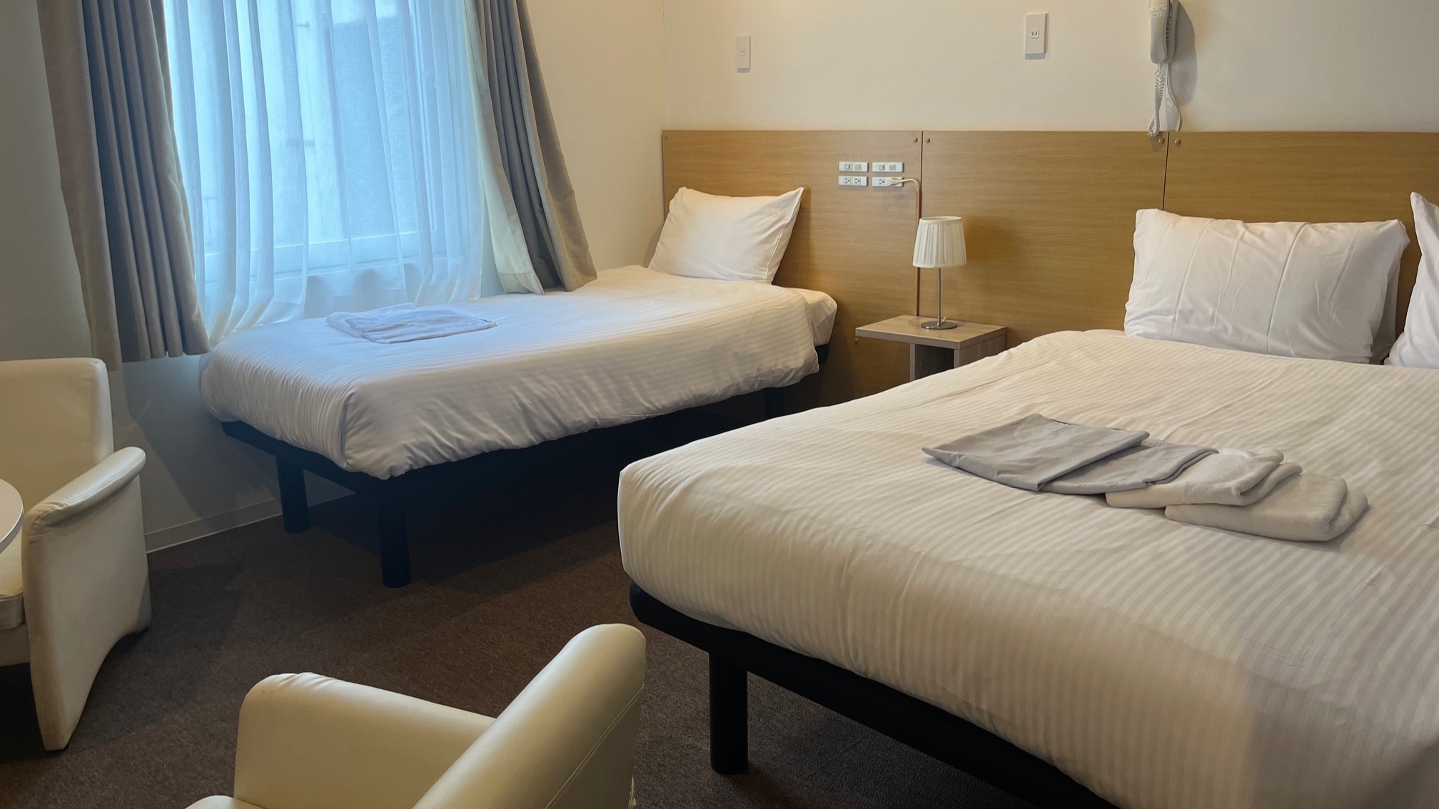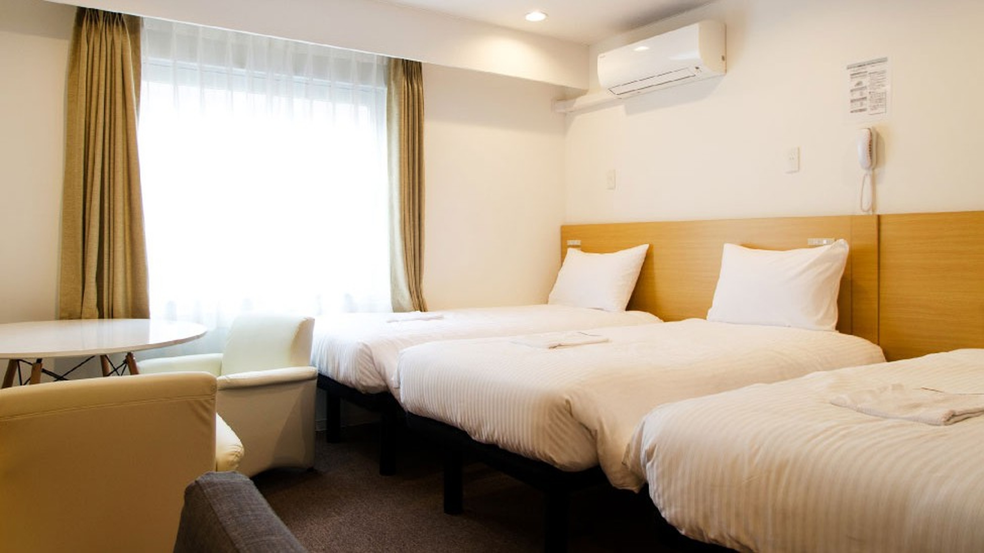 ベッドサイズ:980×1950×3台 客室設備:ユニットバス、テレビ、ケトル、ドライヤー冷蔵庫、金庫、冷暖房(エアコン)、Wi-fi、スリッパ