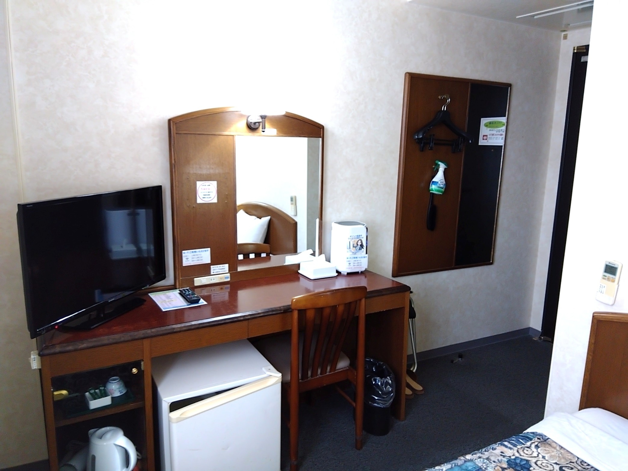セミダブルベッド・ユニットバス・温水洗浄機付トイレ・Wi-FI・32インチ液晶テレビ・CS放送・冷蔵庫、ケトル・内線電話・ドライヤー・個別空調