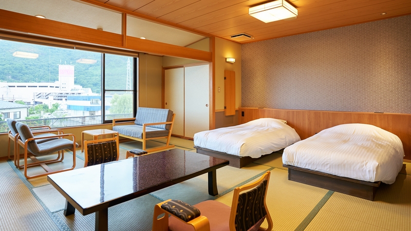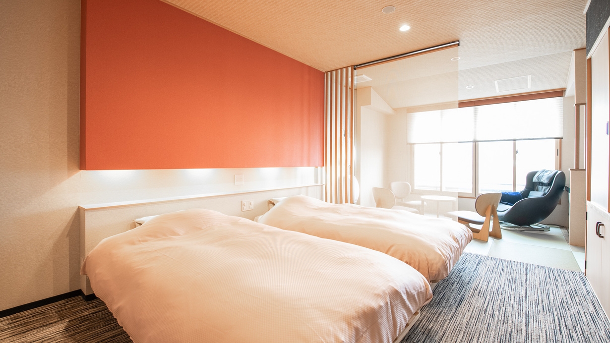 バリアフリーで洋間にツインのベットと和室6畳の和洋室。バス・トイレ付きで手すりが付いています。※添い寝は1部屋2名まで。