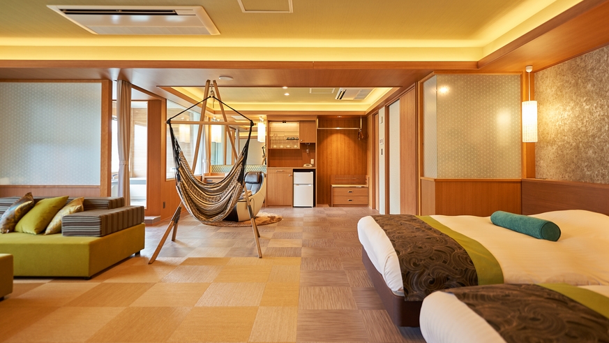 2024年7月、リニューアルオープン。糸柳の「柳」をイメージした客室。アウトバス・シャワーブース付きです。※添い寝は1部屋2名まで。