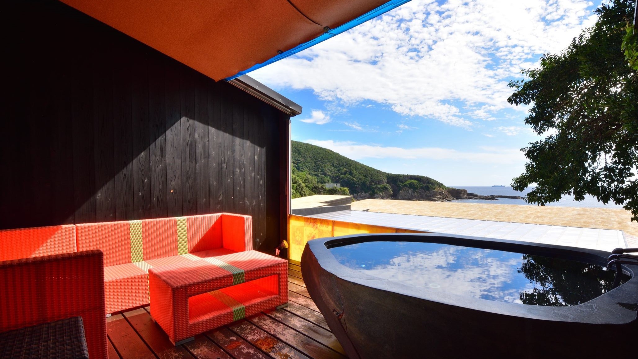 全客室に設置された露天風呂では、古くから湯治場として愛されてきた名湯「椿温泉」を遥かに凌ぐpH9.8のアルカリ硫黄泉が隣地から自噴しています。湯船に手を付けただけで感じる「最強の温泉感覚」は、肌の古い角質を落とし、新陳代謝を促進する美肌効果も期待できます。電動開閉式の屋根と海側の壁を開ければ、潮風を感じながら刻々と表情を変える海を眺め、夕焼けに染まる空や満点の星空を独り占めできるでしょう。