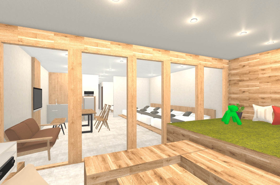 大人5・6名様目はエキストラベッドにてご案内しております、大人7・8名様目はご自身で寝具のご用意をお願い致します