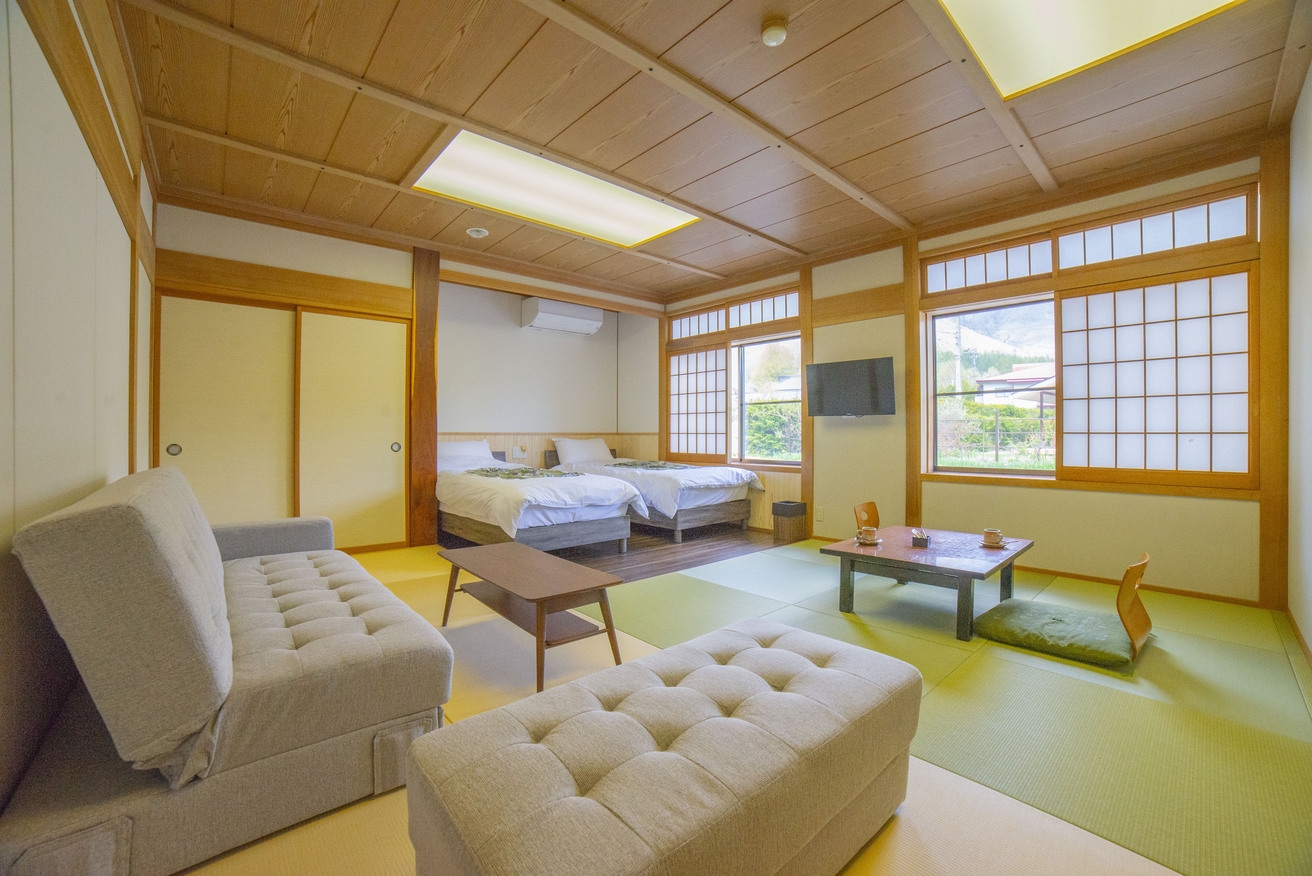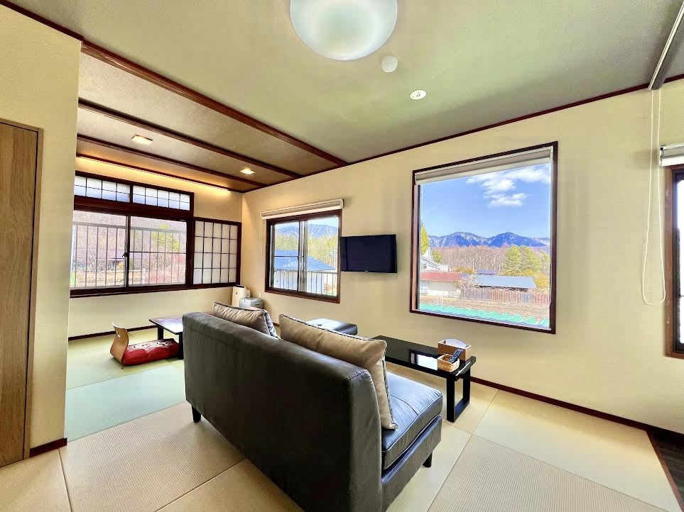 2025年4月にリニューアル・ 居室・寝室部・和室部の3スペースに分かれています。 山里の奥に山が見え一部の窓から乗鞍岳を見ることもできます。 2階の客室。