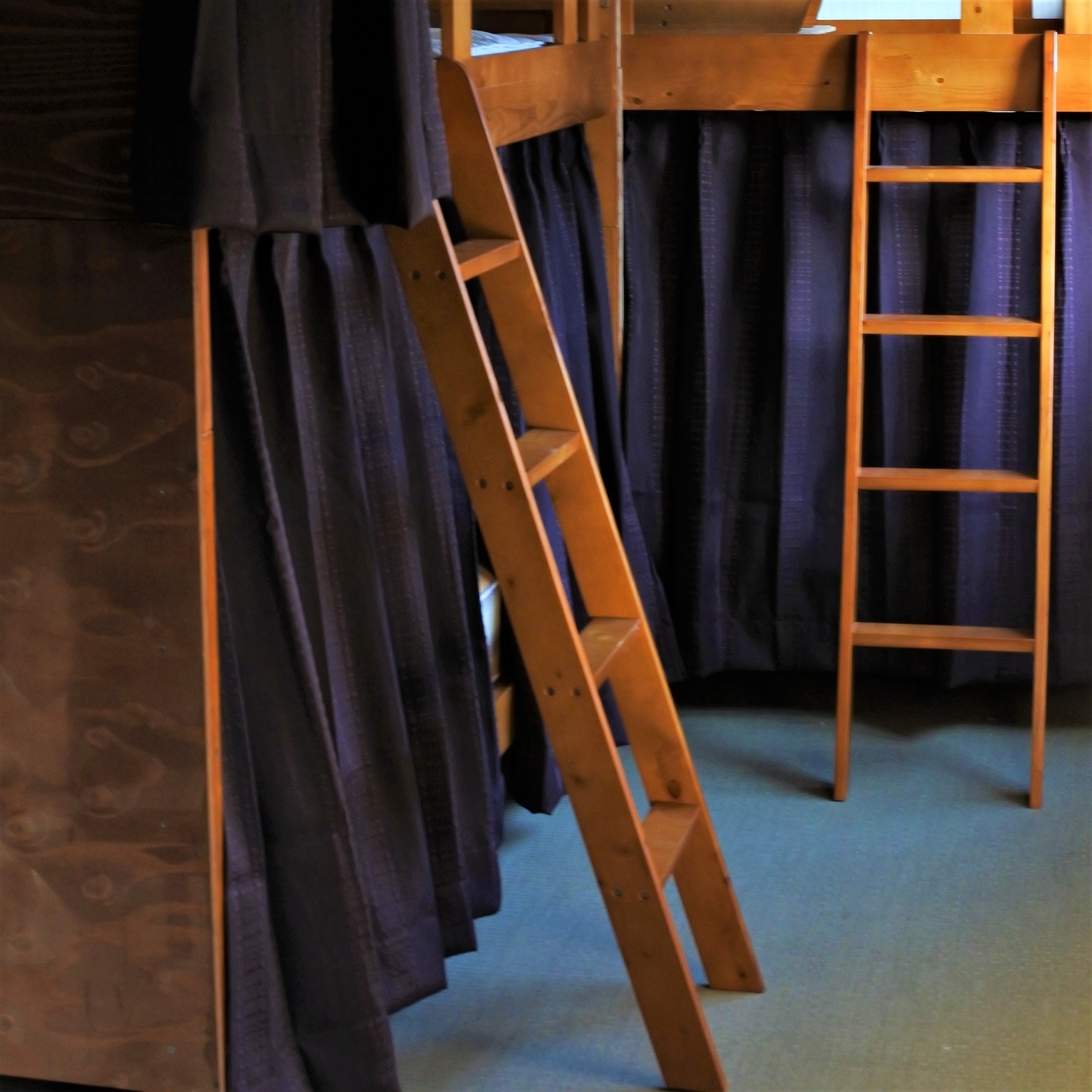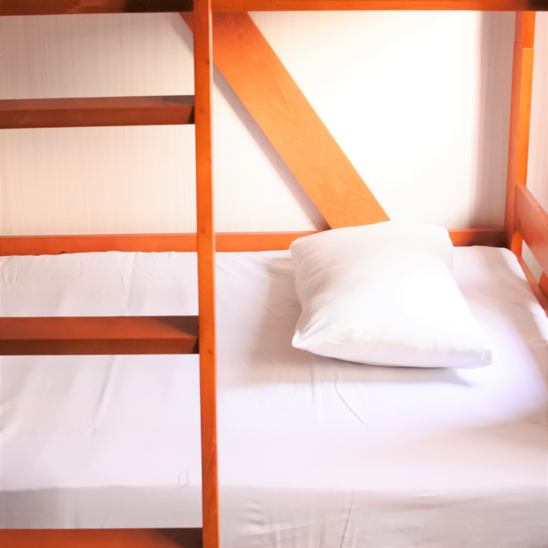 二段ベッドのうちベッド1台。幼児、小学生、お連れの方は電話連絡ください。いびきや足音が気になる方にはおススメいたしません。個室をお選びください。