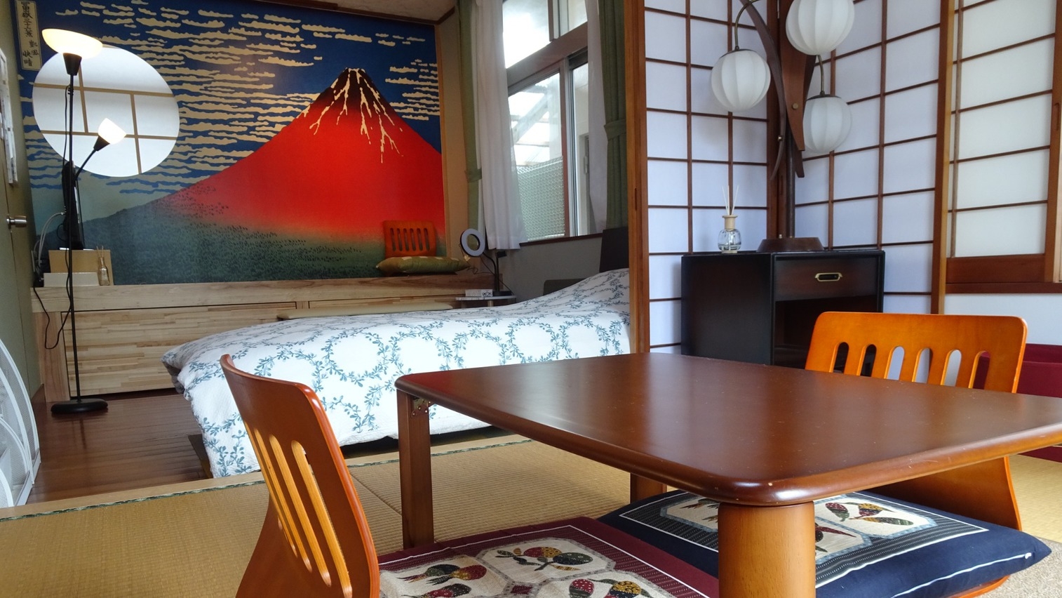 庭に面した畳のお部屋です。大人1名につき幼児添い寝1名無料 布団×6 無料Wi-Fi、32インチモニターテレビ(地上波・BS)、エアコン完備 風呂・トイレ共用