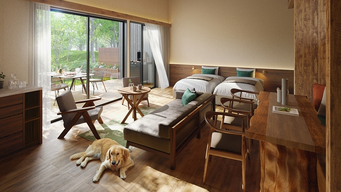 【エリア】ASOBIYUKU VILLA内 【間取り】ツインルーム、ミニバー(有料)、リビング、ダイニング、キッチン、バス、トイレ、テラス 【風呂】温泉使用