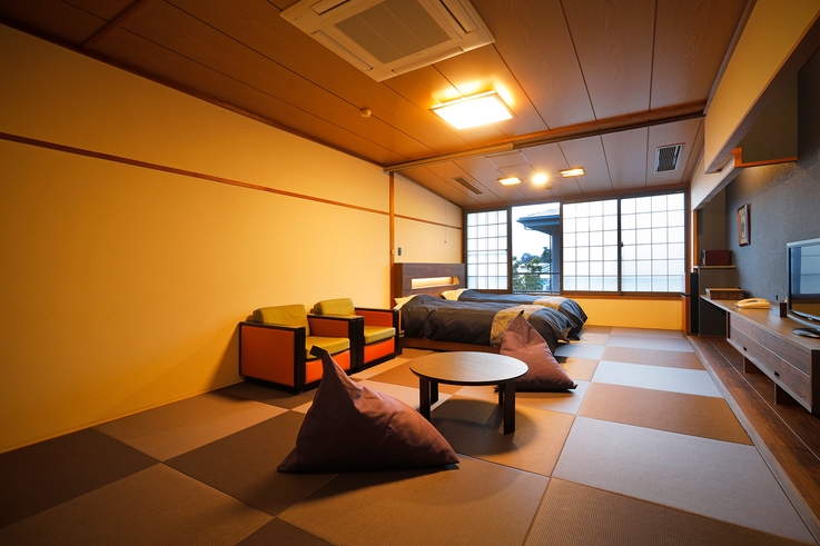 洋室はw1200のゆったりベッドのツインとなり、3名様からは和室でのお布団となります。お部屋は2階になり階段での移動になります。