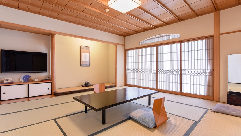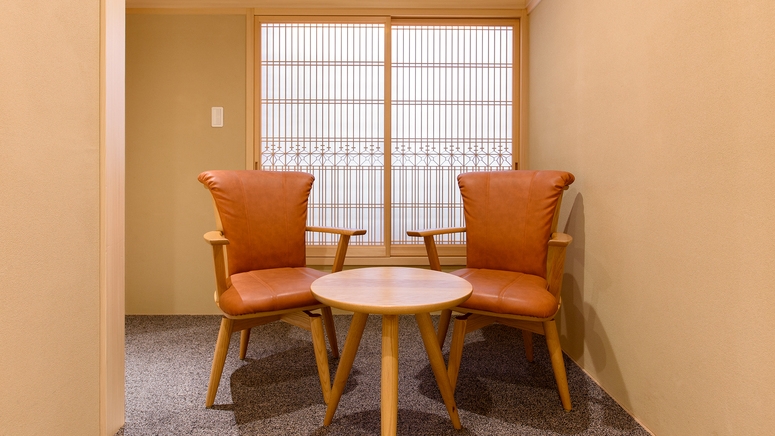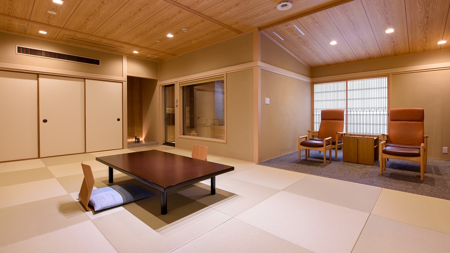 お部屋はすべて数奇屋風造り、12.5畳以上の広い間取りです。広縁には小テーブルとチェアがございます。日本の伝統紋様を織り込んだ工芸品レベルの組子障子を使用。