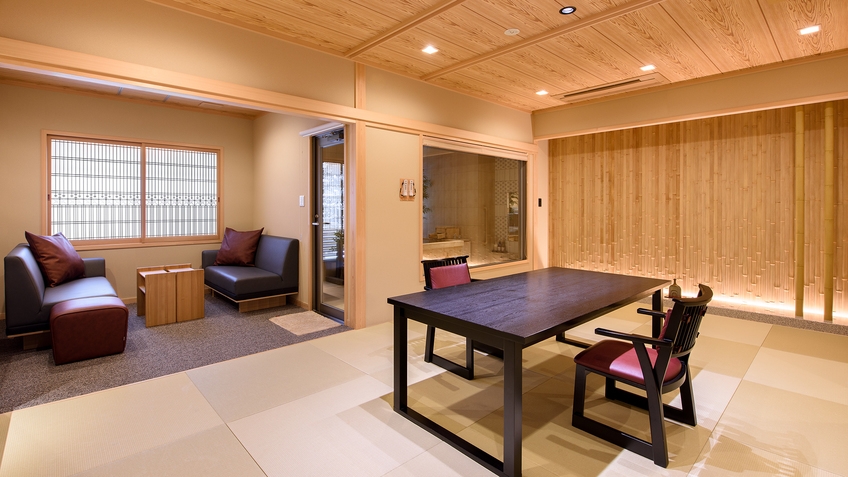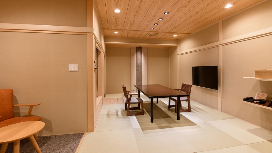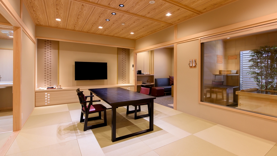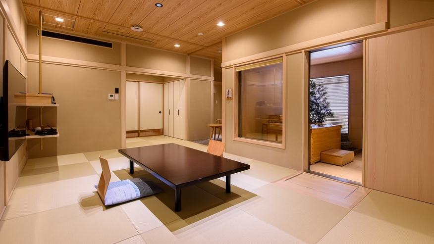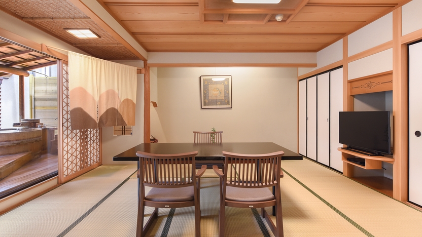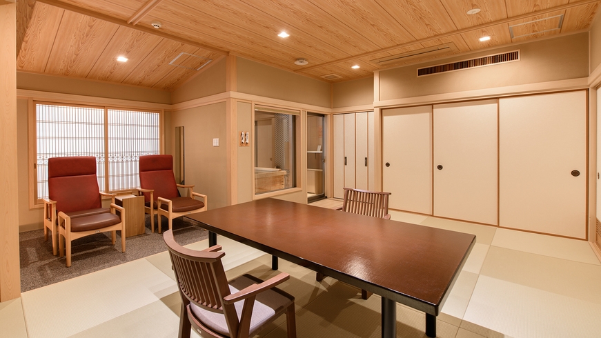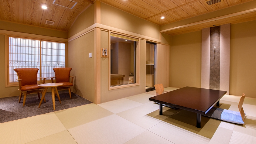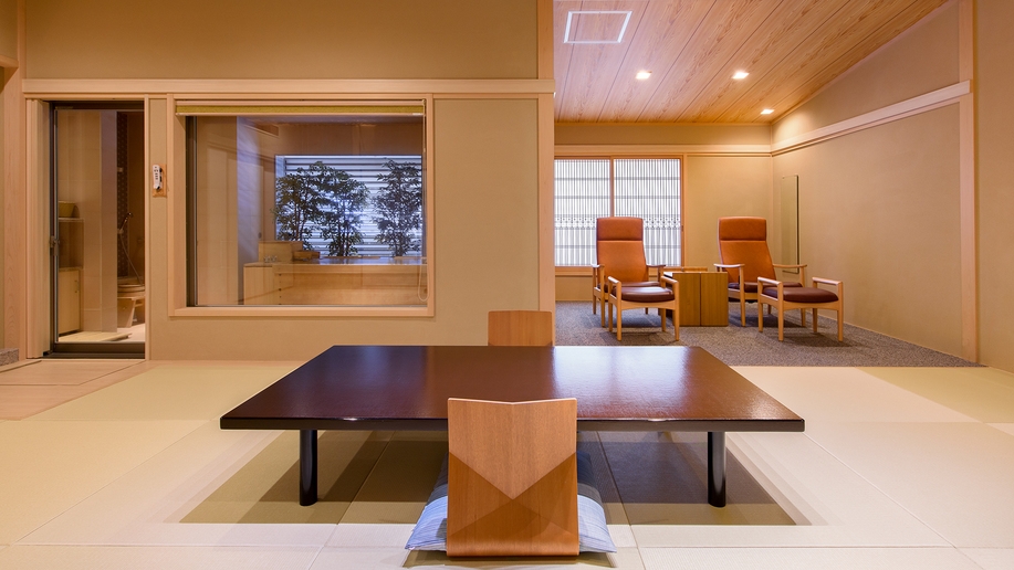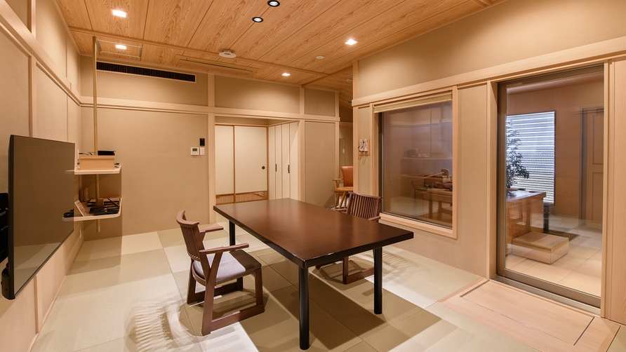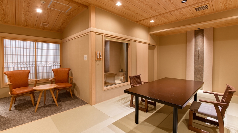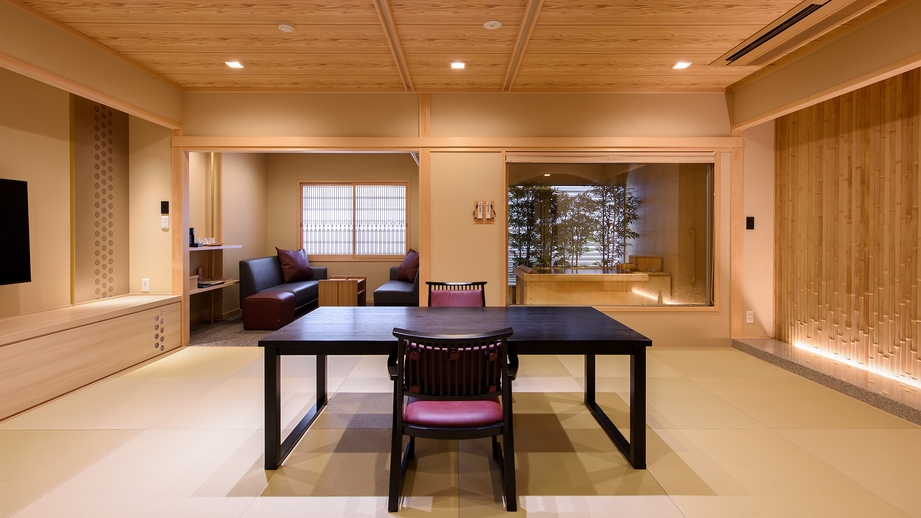 外面に電動式の外付ブラインドを設置した、屋外の空気を感じられる新タイプの室内露天風呂付き。※ご好評の椅子テーブル式です。座卓式への変更不可。