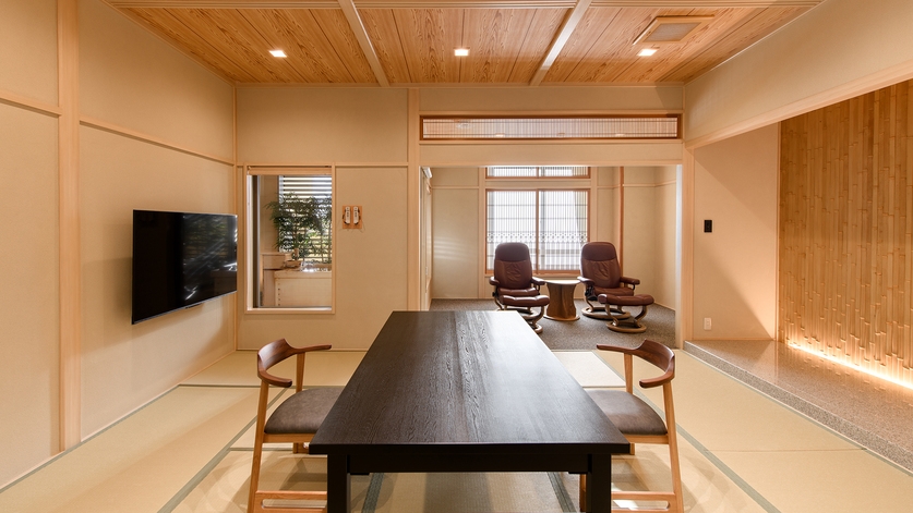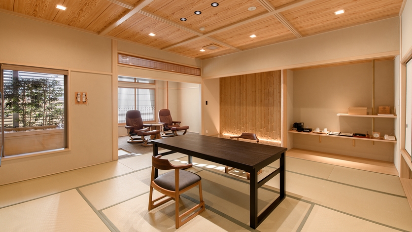 お部屋はすべて数奇屋風造り、12.5畳以上の広い間取りです。広縁には小テーブルとチェアがございます。日本の伝統紋様を織り込んだ工芸品レベルの組子障子を使用。