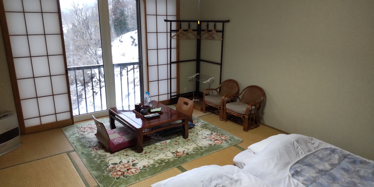 大自然の秋山郷を一望出来るお部屋です。テレビ・エアコン・冷蔵庫・ドライヤー完備。バス・トイレ・洗面台は部屋にはありません。
