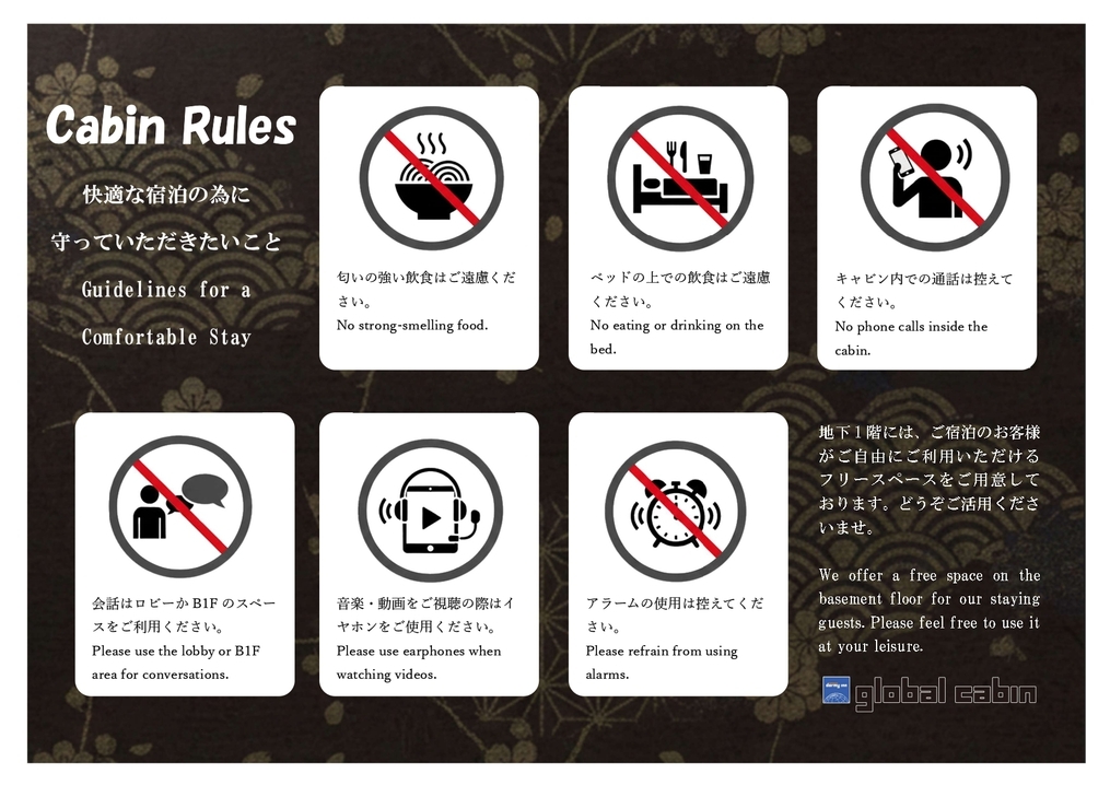 ※こちらはホテルの客室とは相違点がございます。旅館業法上キャビン(カプセル)はお部屋に鍵をかける事が出来ません。その他下記注意事項をご確認下さい。