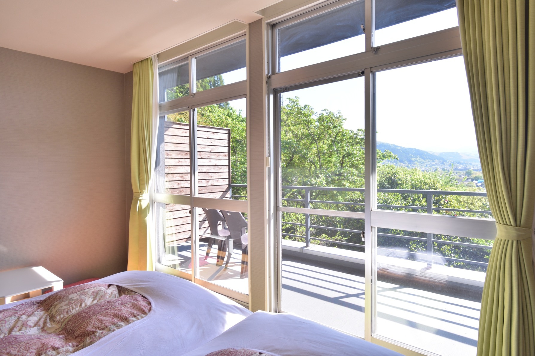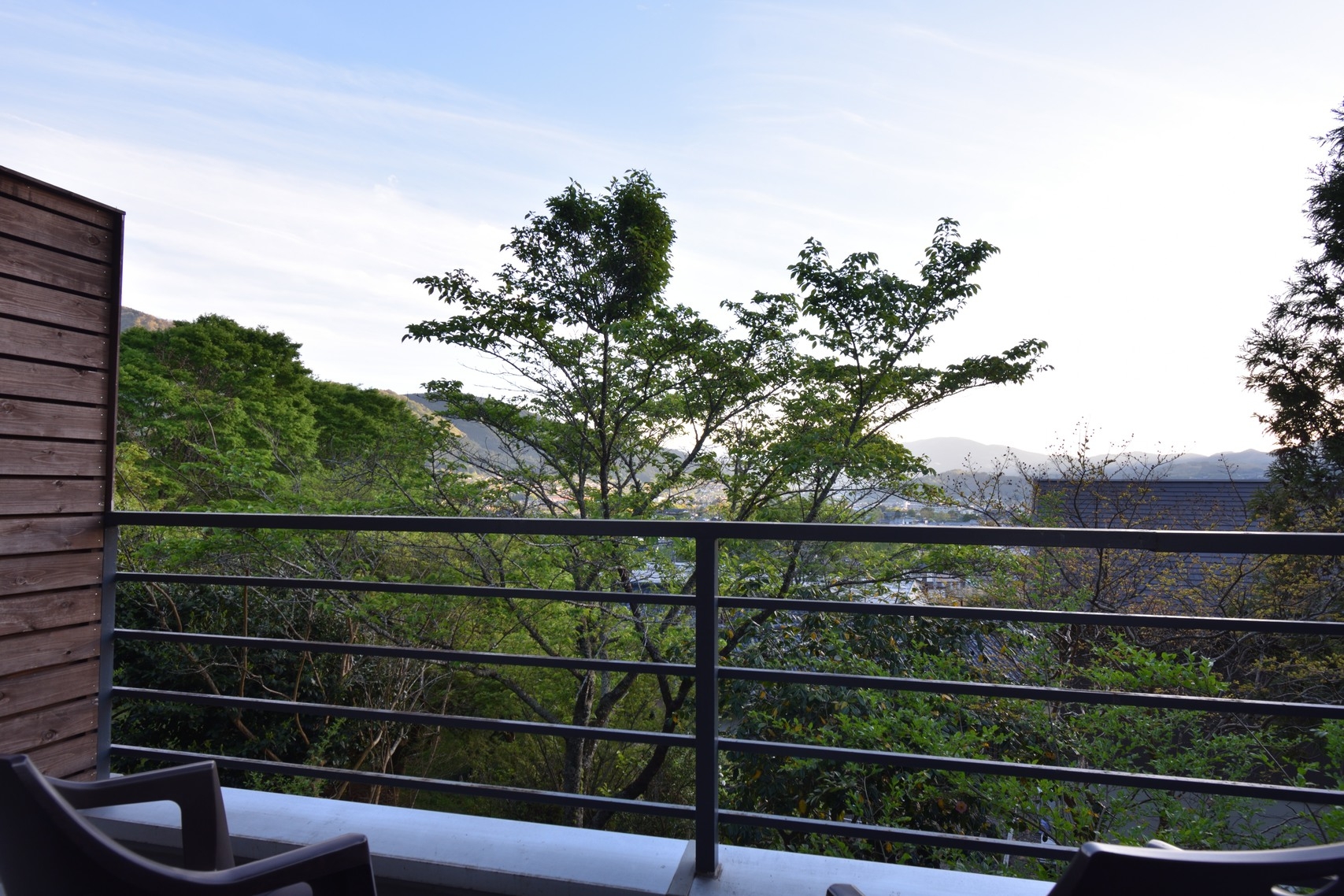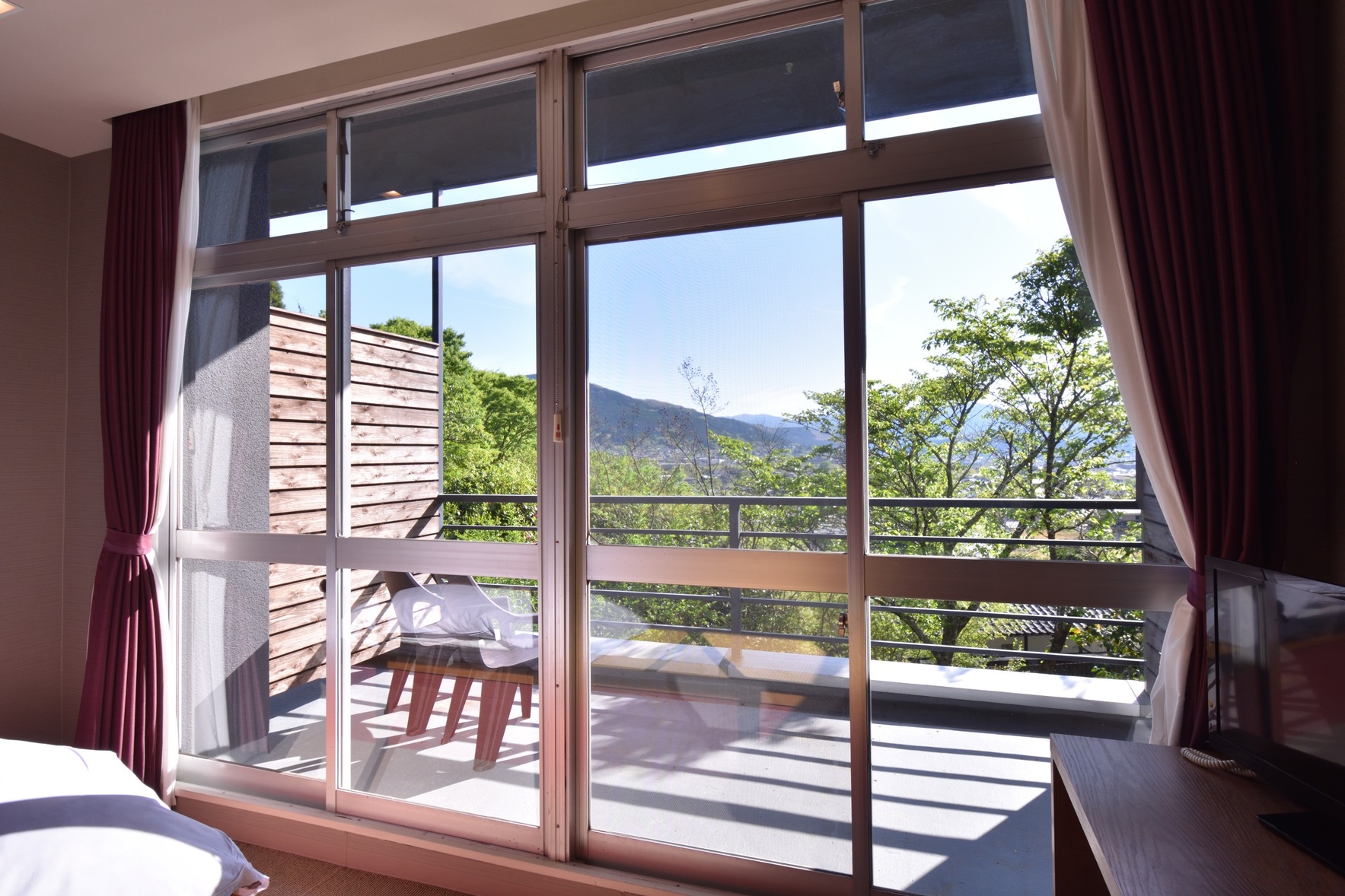 【角部屋】窓から由布院の街を望むお部屋♪お部屋窓外には小さなテラスがあり、天気の良い日はチェアーに座って由布院の街にゆっくりと日が落ちるのを見られます。