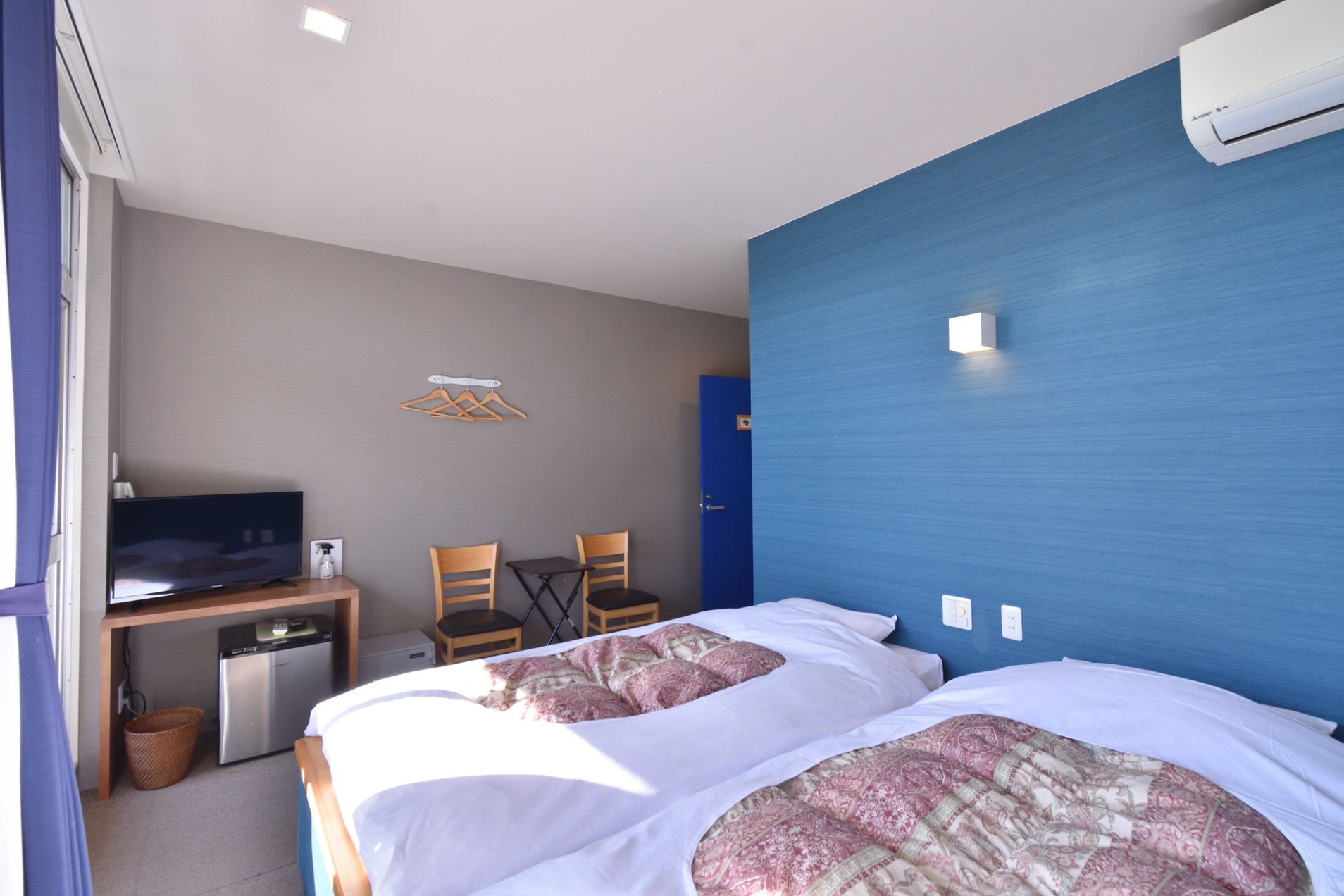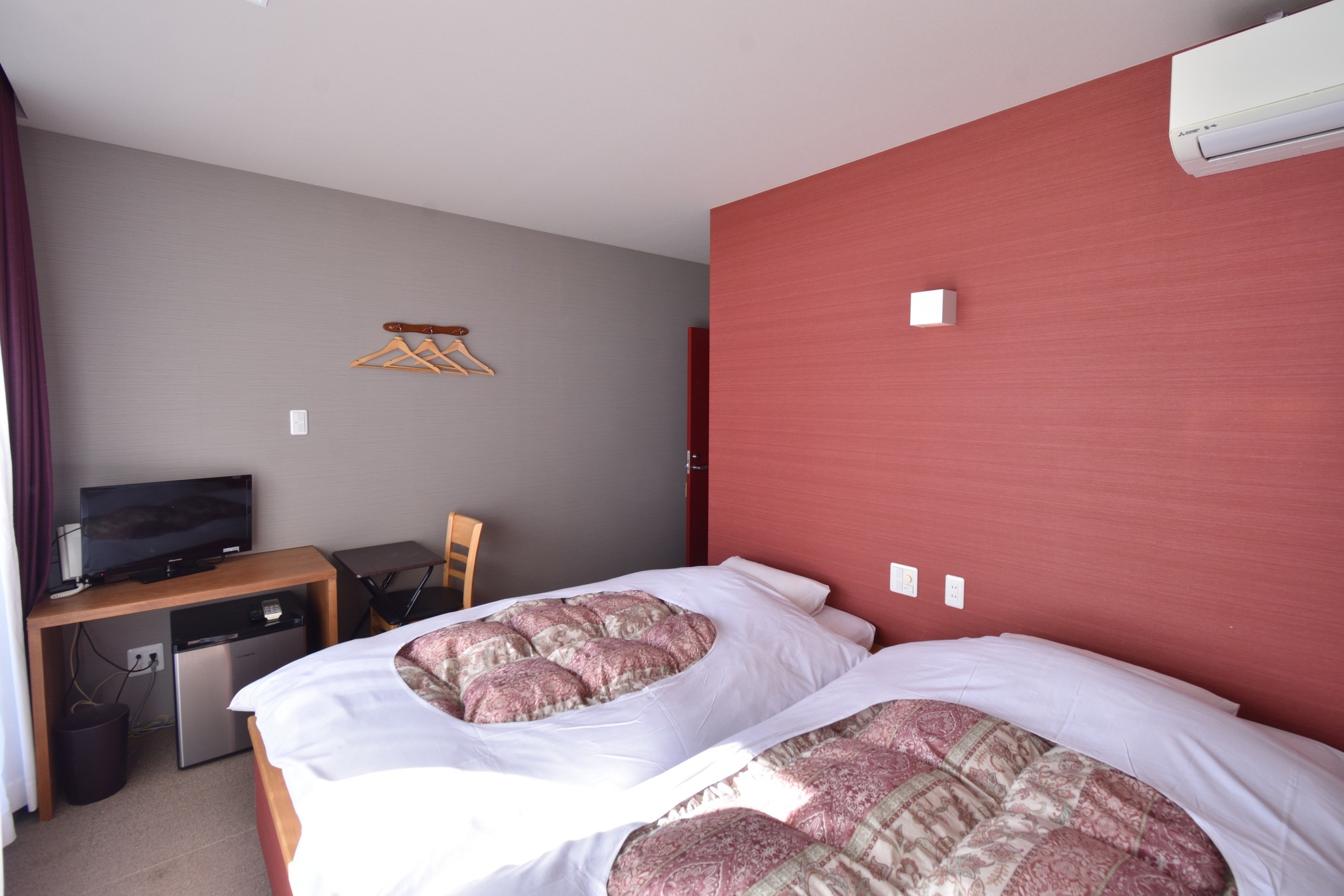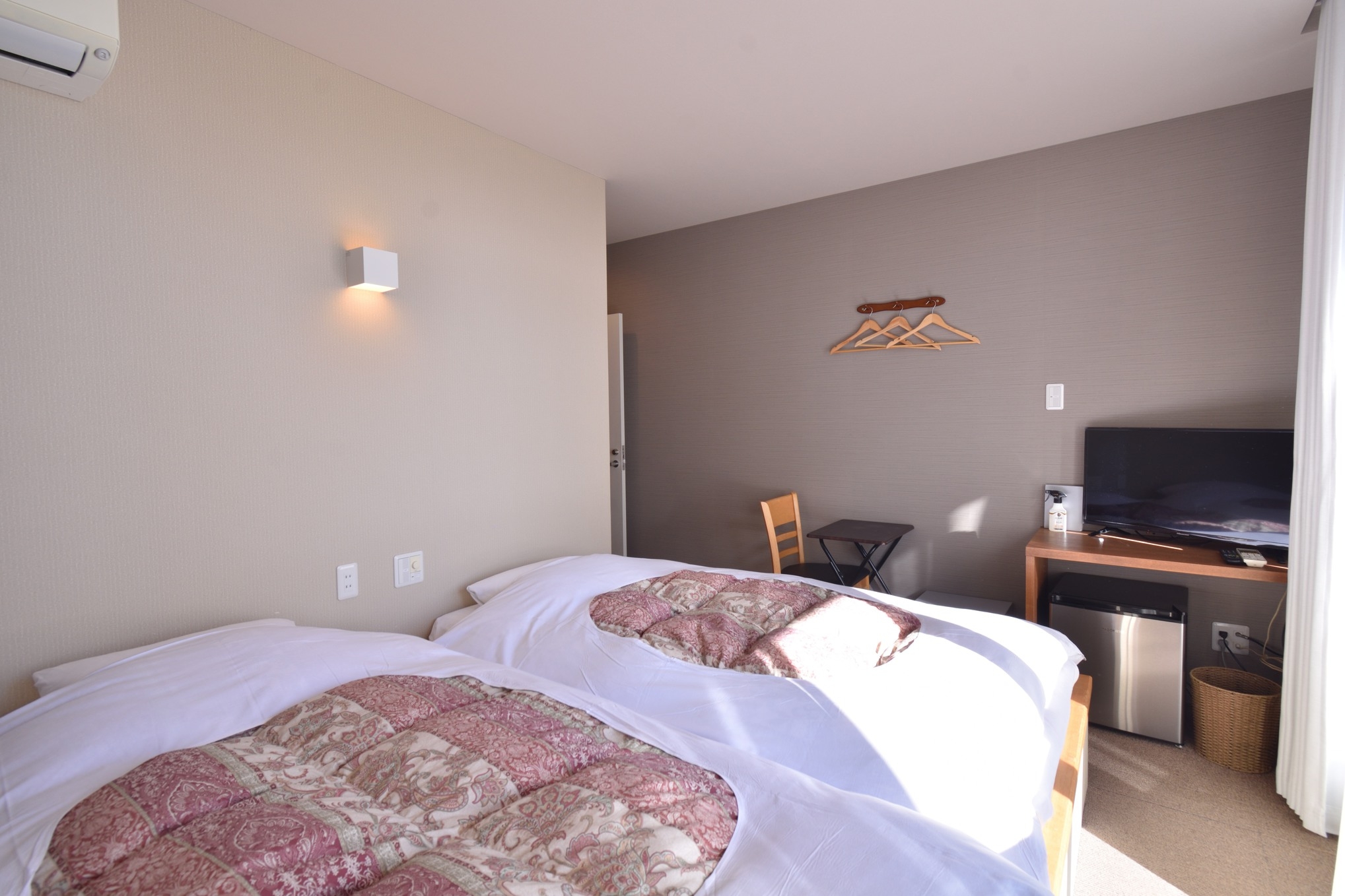 2F由布院眺望のお部屋で18平米と通常より少しだけ狭いお部屋となっております。お部屋設備等は全てスタンダードタイプと同じ。大人2名様でお使いいただけるお部屋です