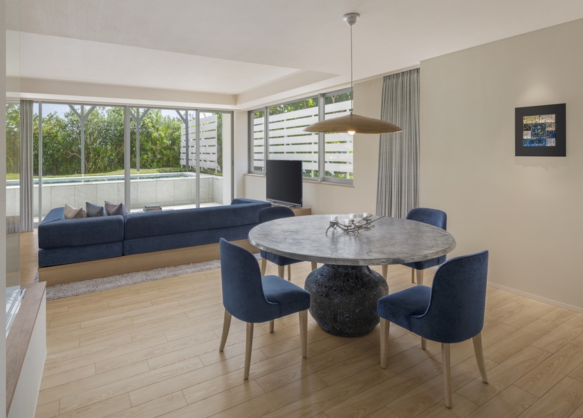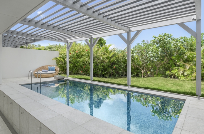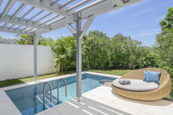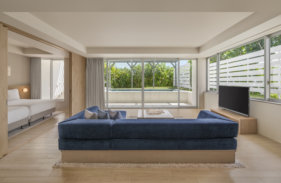 プライベートプールとガーデンを備えた約67平米のお部屋。1室3名様でご予約の場合はソファベッドをご用意。お子様含め最大4名様まで利用可能。