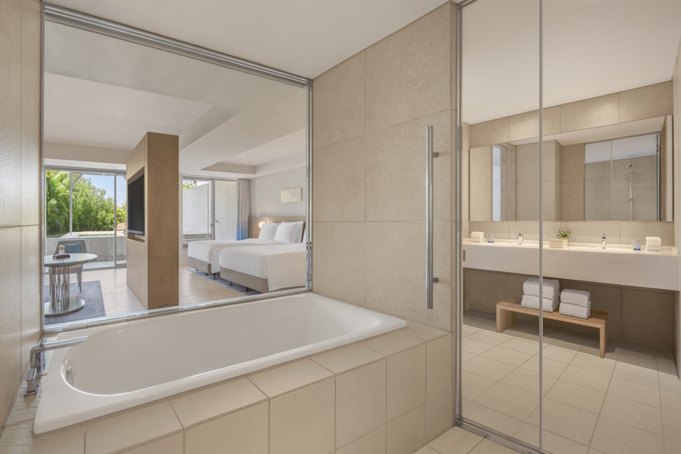 広々プライベートテラスにはプールとデイベッドを備えたベット2台のお部屋。1室3名様又はお子様含め最大4名様まで利用可能。