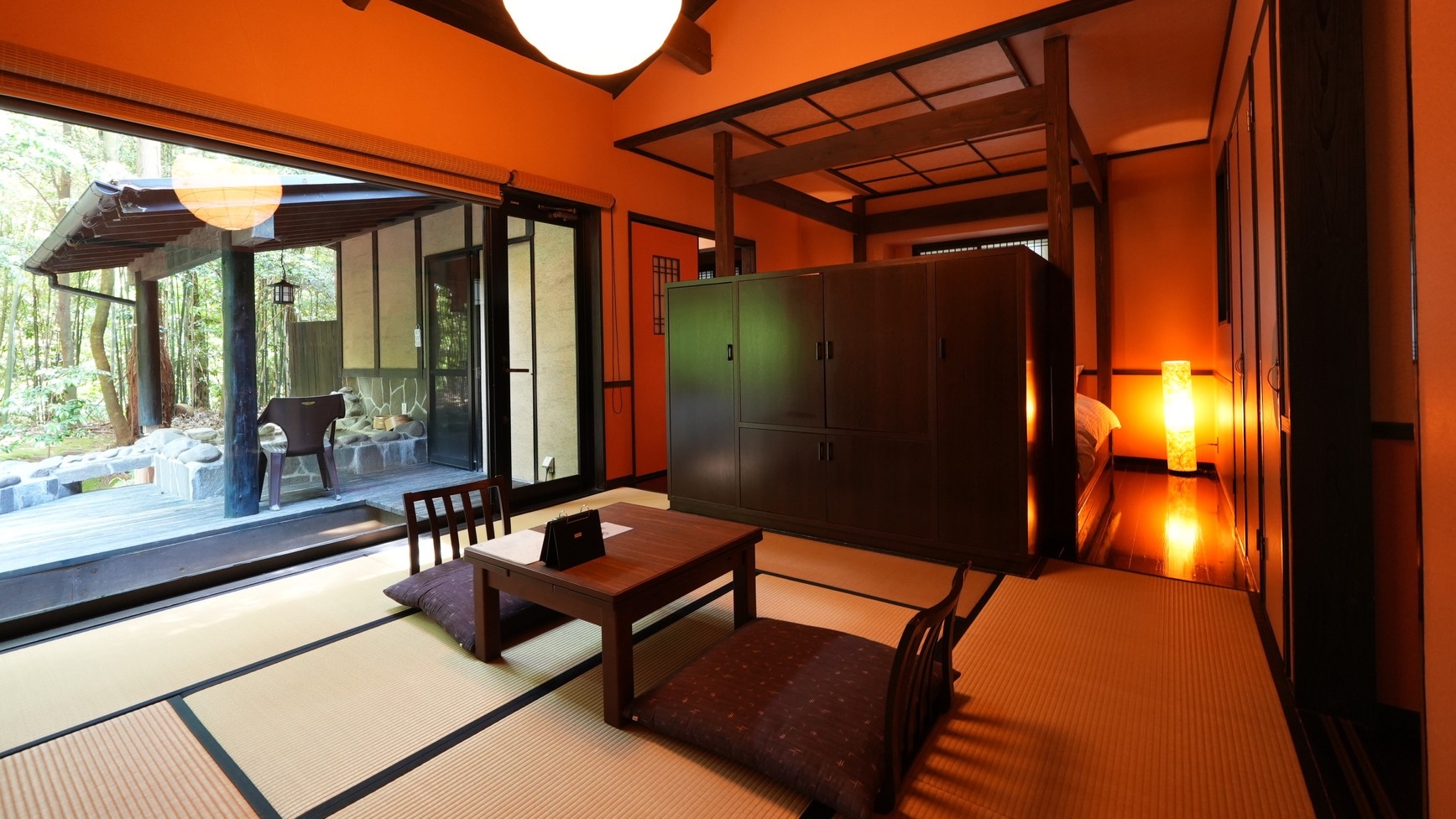 全室 源泉かけ流しの露天風呂・寝湯・水風呂・内湯付きです。また岩盤浴も各部屋に備付けております。
