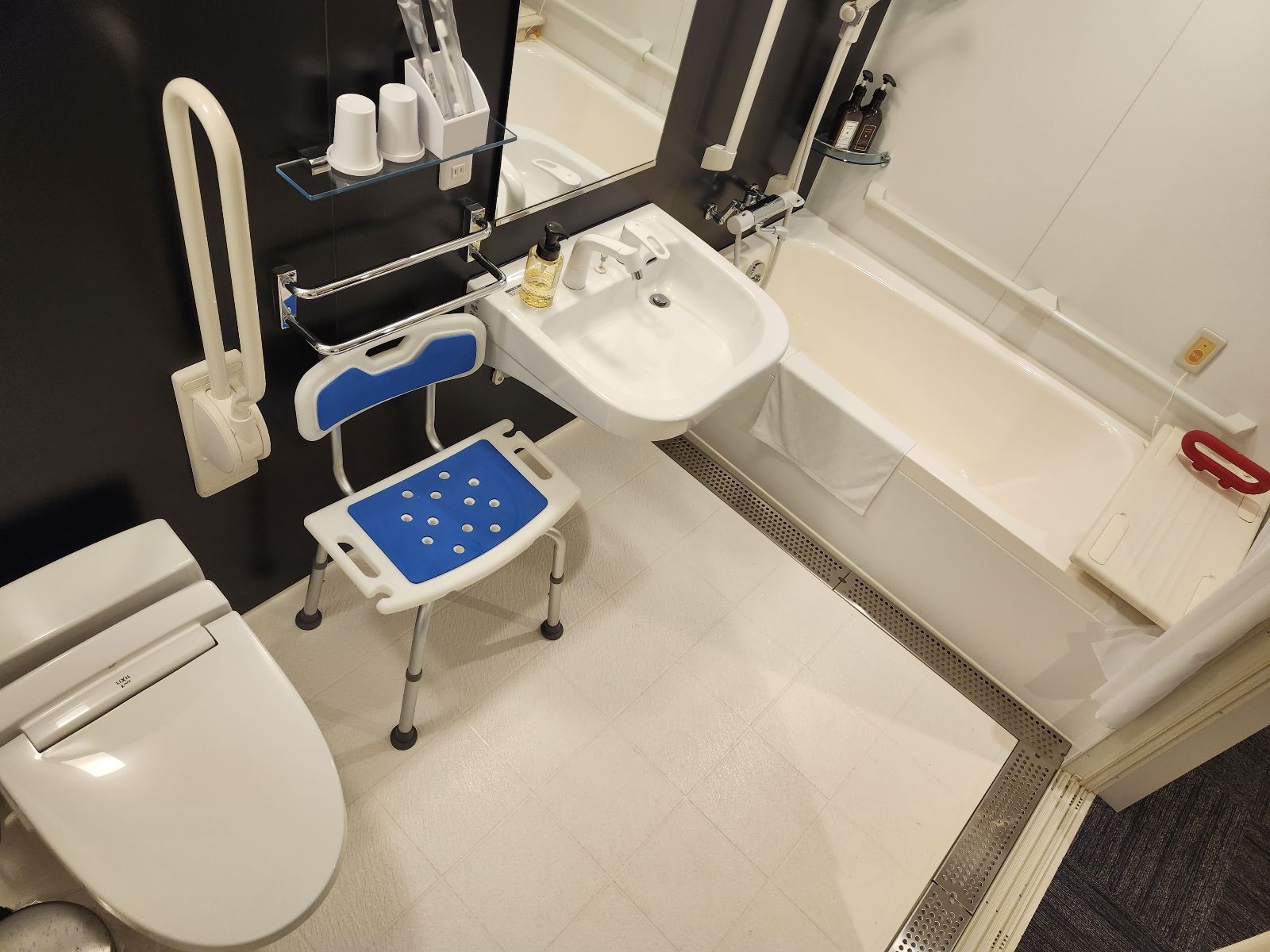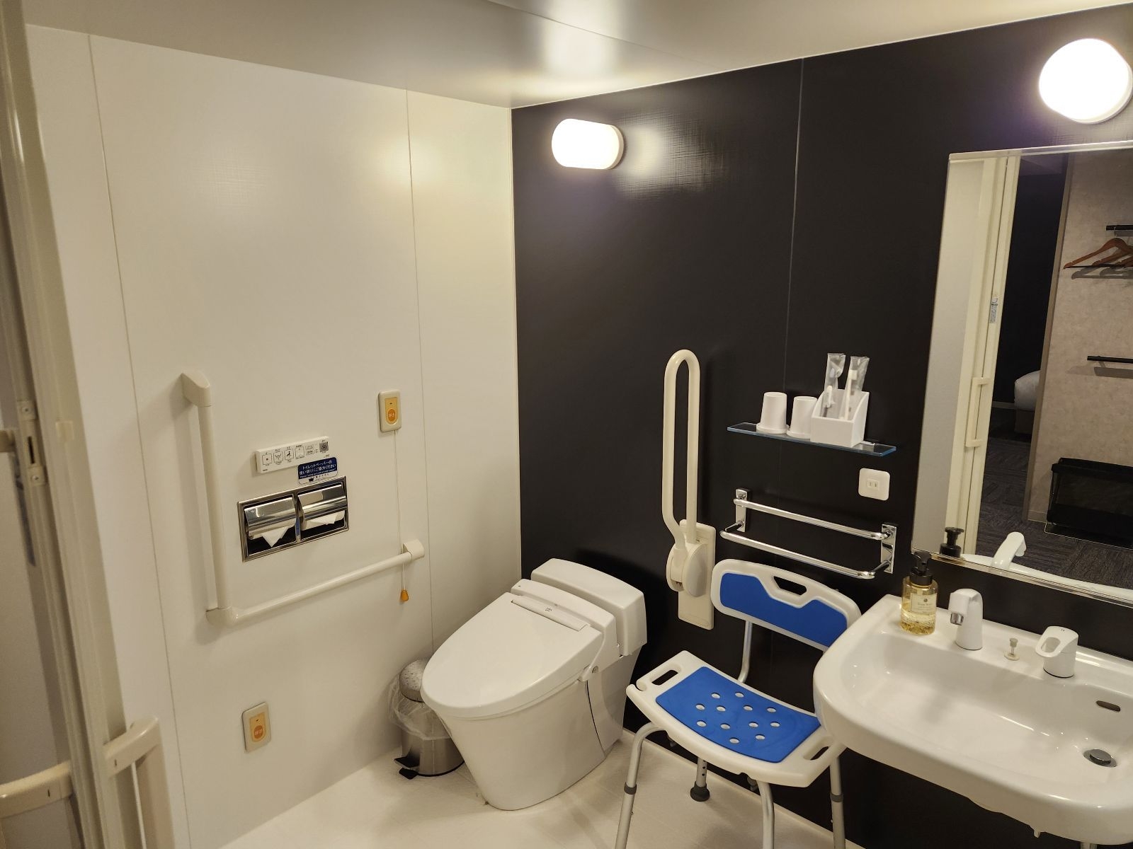 車いすの方もご宿泊頂けるユニバーサルルームをご用意。バス・トイレには車いすの方もご利用いただける補助具を導入し、立ち上がるのが大変なシニアの方にもおすすめです。