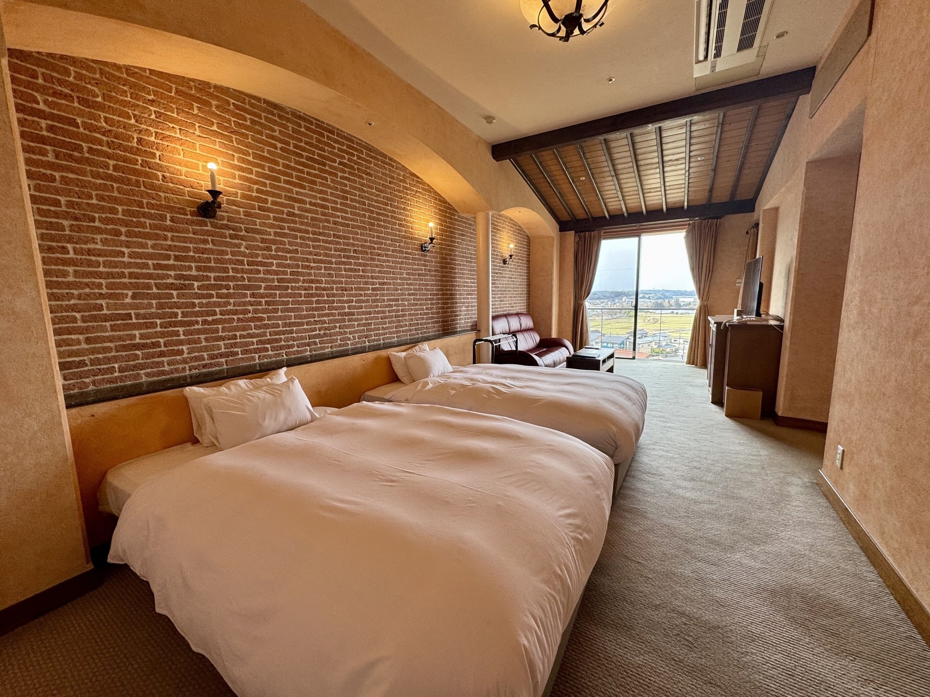 クラシカルなヨーロピアンスタイルが広がるデラックスツイン 上質なインテリアと土間のタイルが海外のリゾートを演出 心躍る空間でお過ごし頂けます。