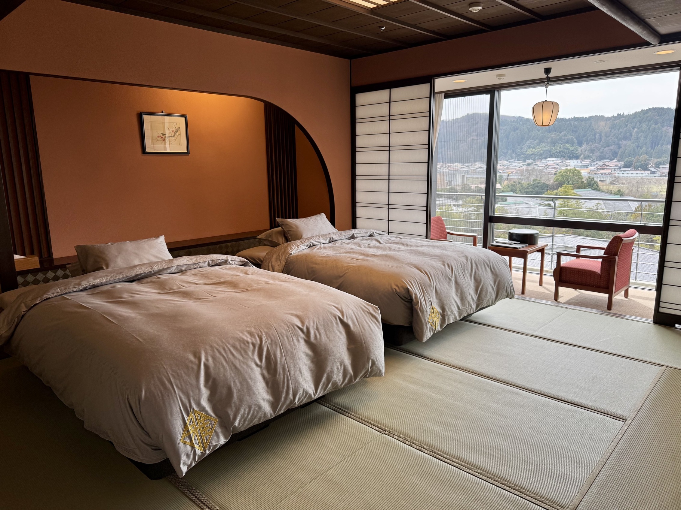 大きな窓の向こうに広がる庭園を望むデラックス和洋室 畳の安らぎとベッドの快適さを兼ね備えた空間で 四季の景色とともに贅沢な時間をお過ごしいただけます。