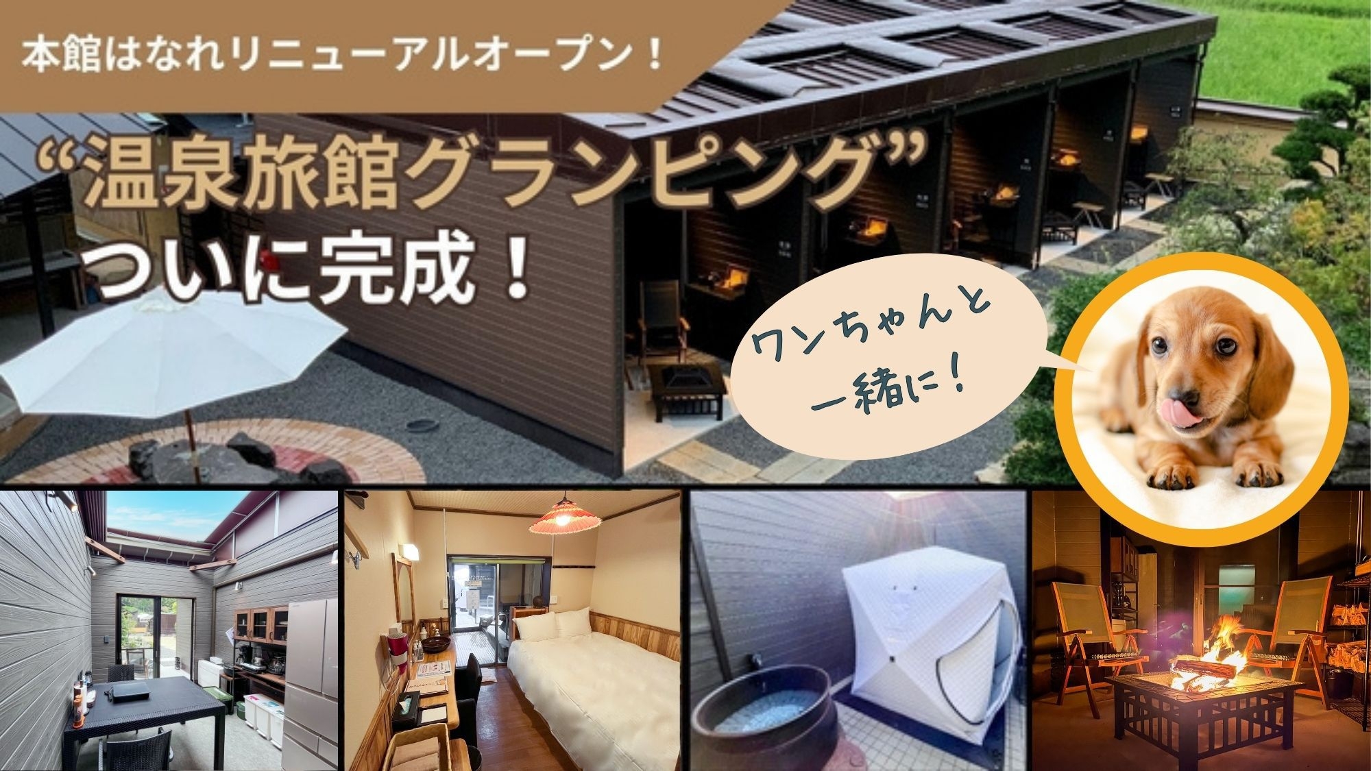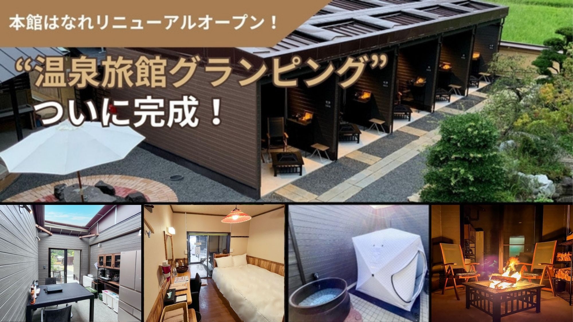 旅館、グランピング、温泉旅館グランピング、全ての客室で源泉かけ流しの温泉をご堪能いただけます。