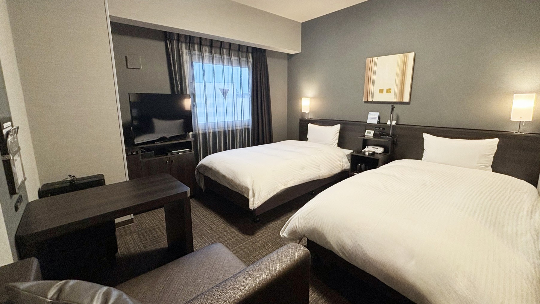 こちらのお部屋では通常の紙巻きたばこはご利用いただけません。WOWOW無料視聴、ベッド110×195(cm)、40型液晶TV・天井埋込形ナノイー発生機設置