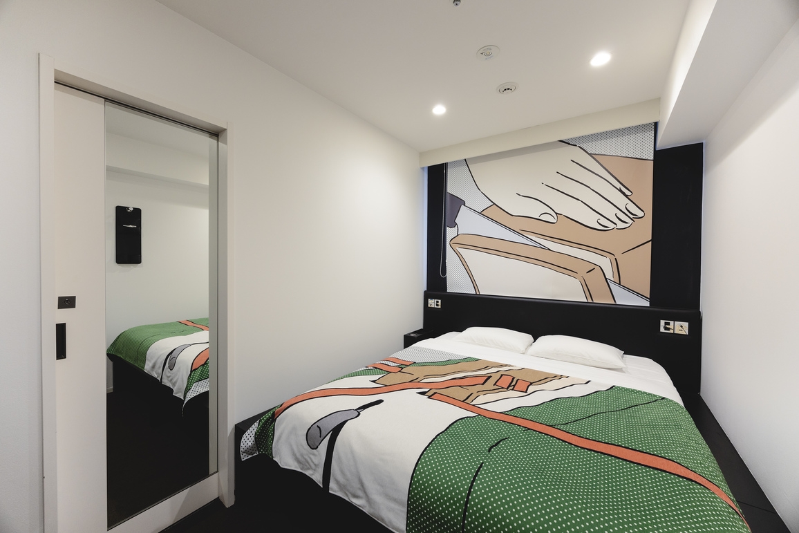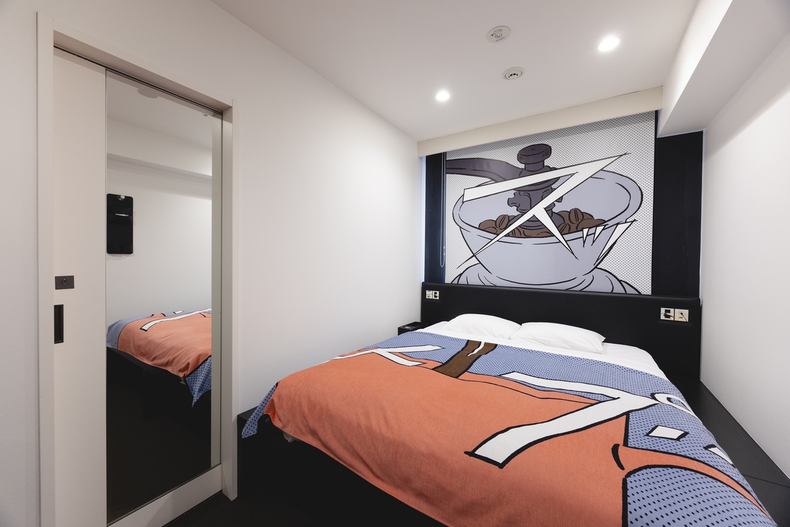 客室は朝の1コマをイメージした漫画調になっており、コンパクト(12㎡)でありながら十分な居住面積を確保。リラックスできる空間を提供いたします。