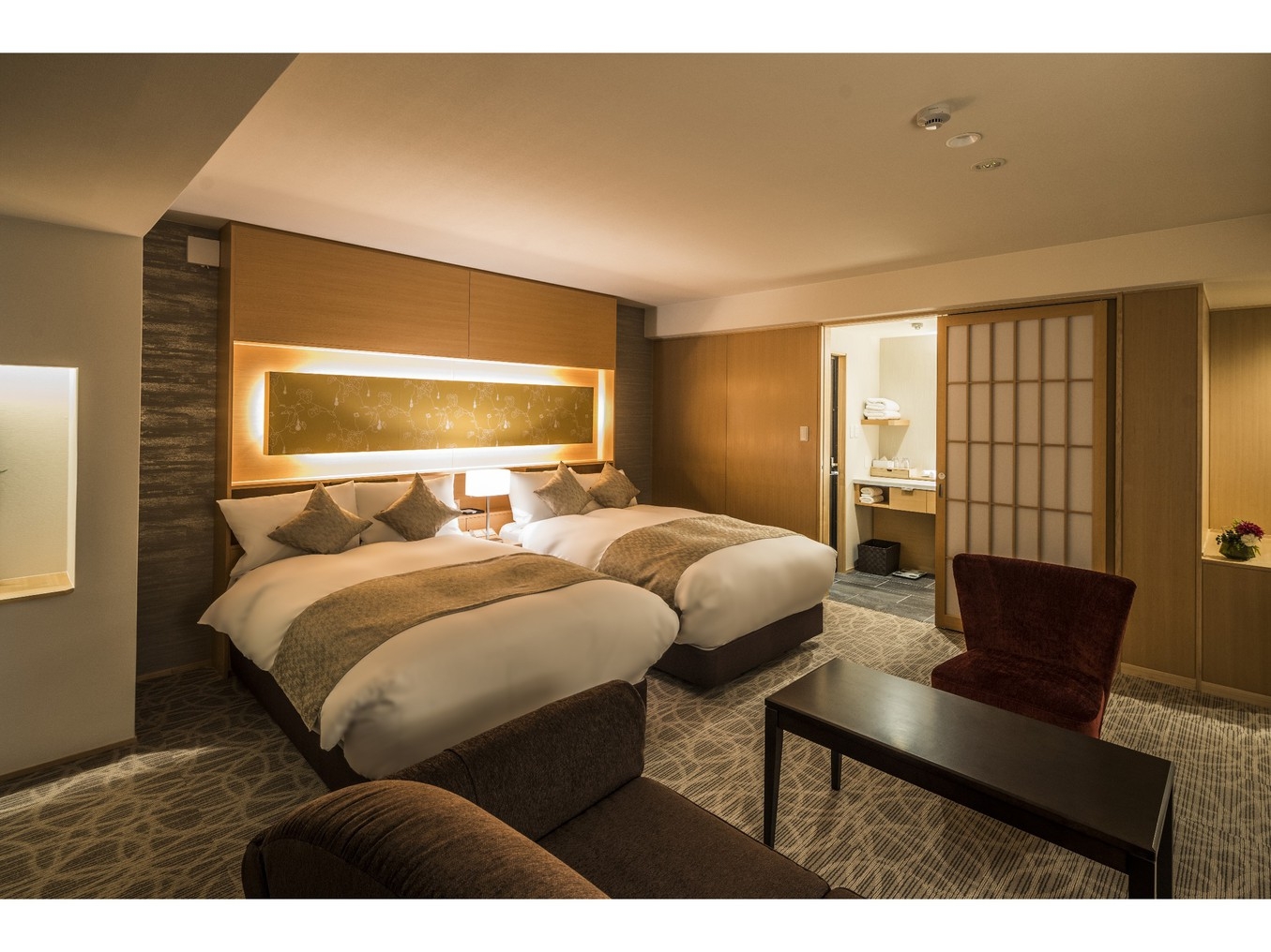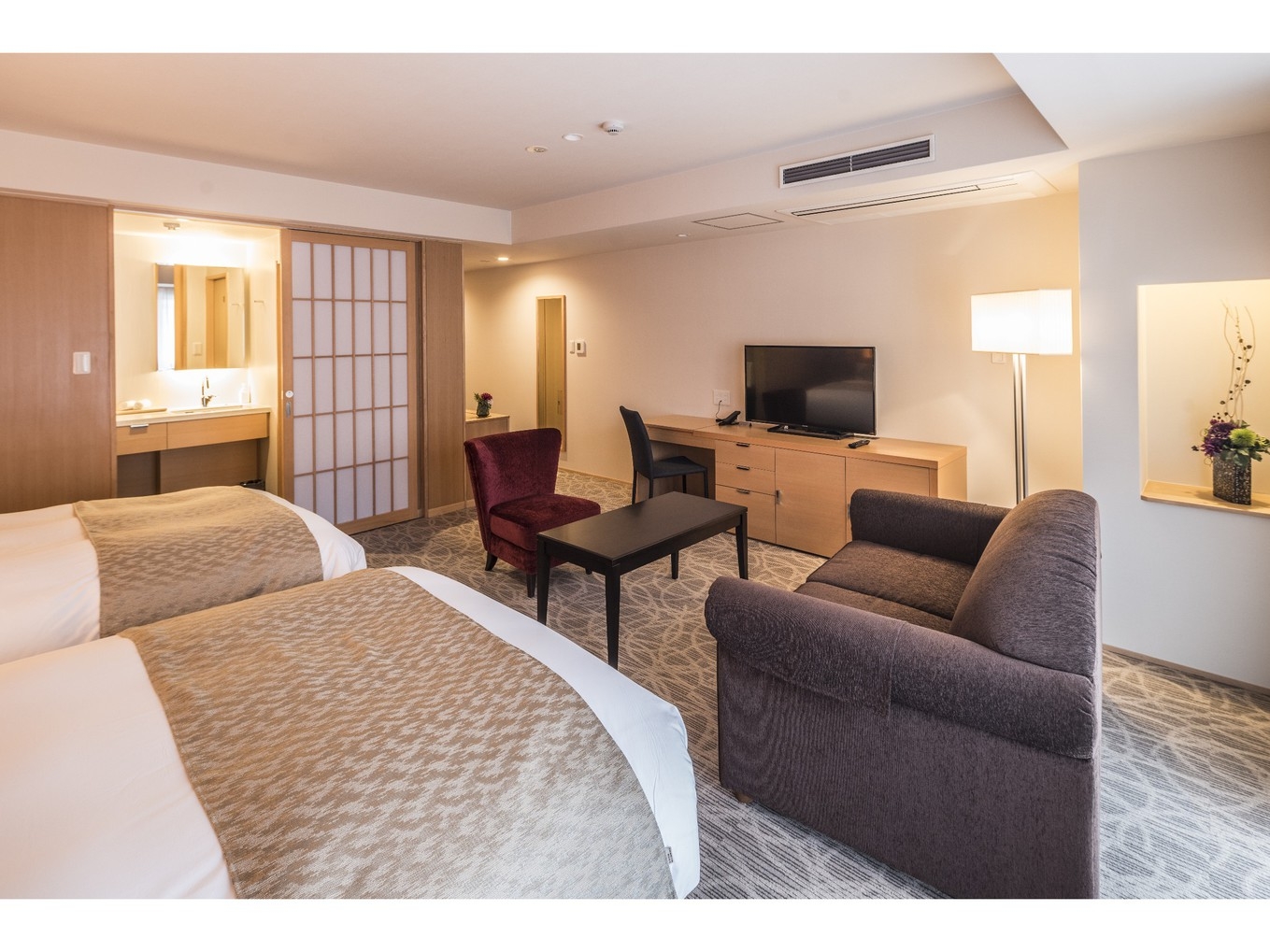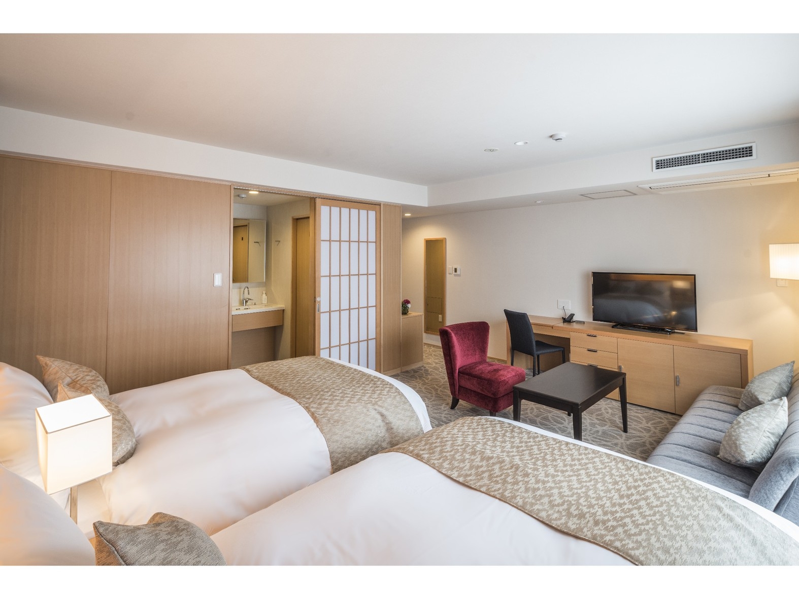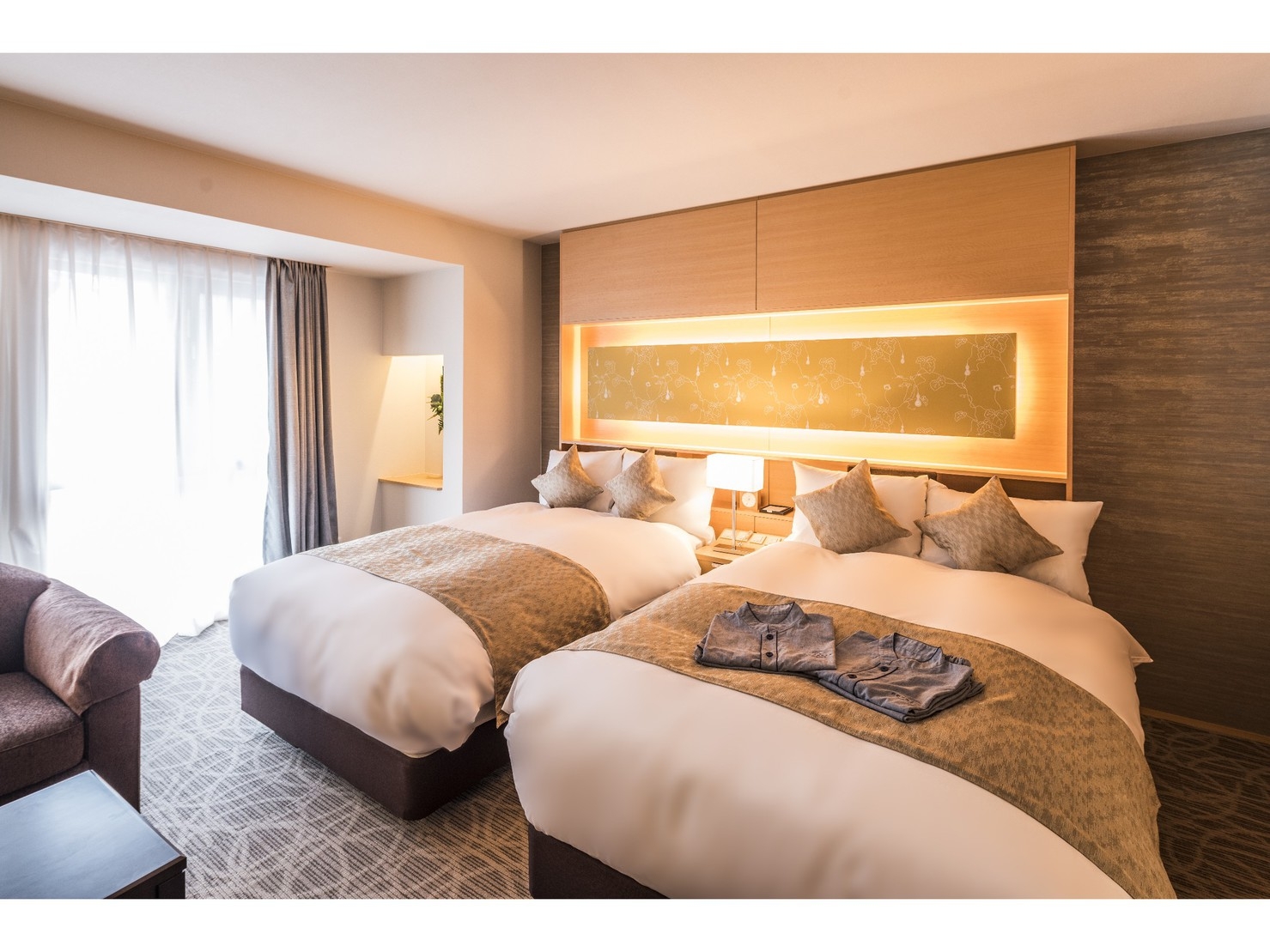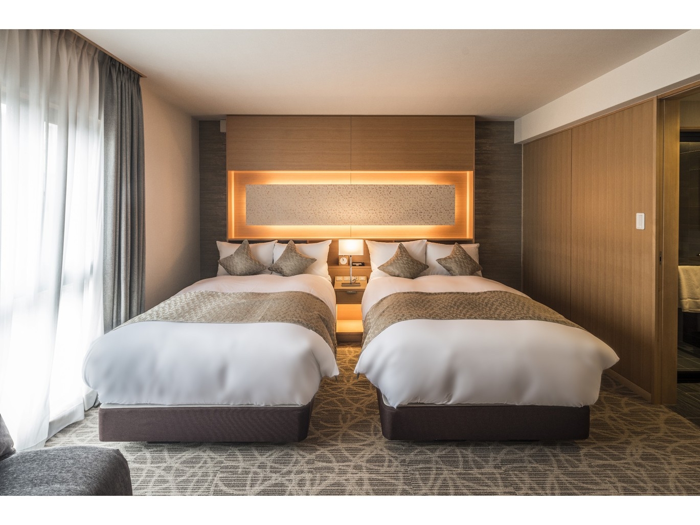 1200mmサイズのシングルベッドが2台設置されたツインルーム。広々とした空間に、快適性にこだわった客室でゆったりとした寛ぎの時間をお過ごしください。