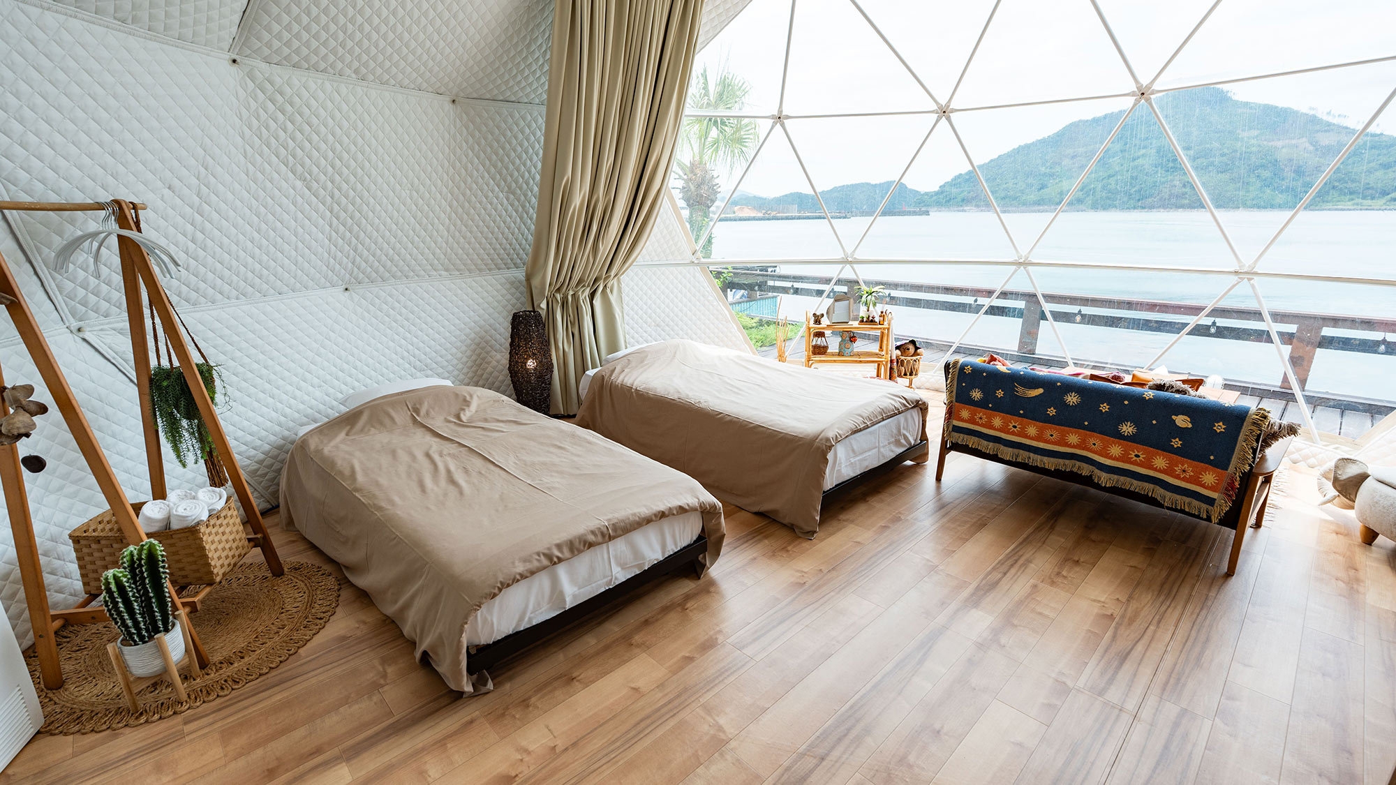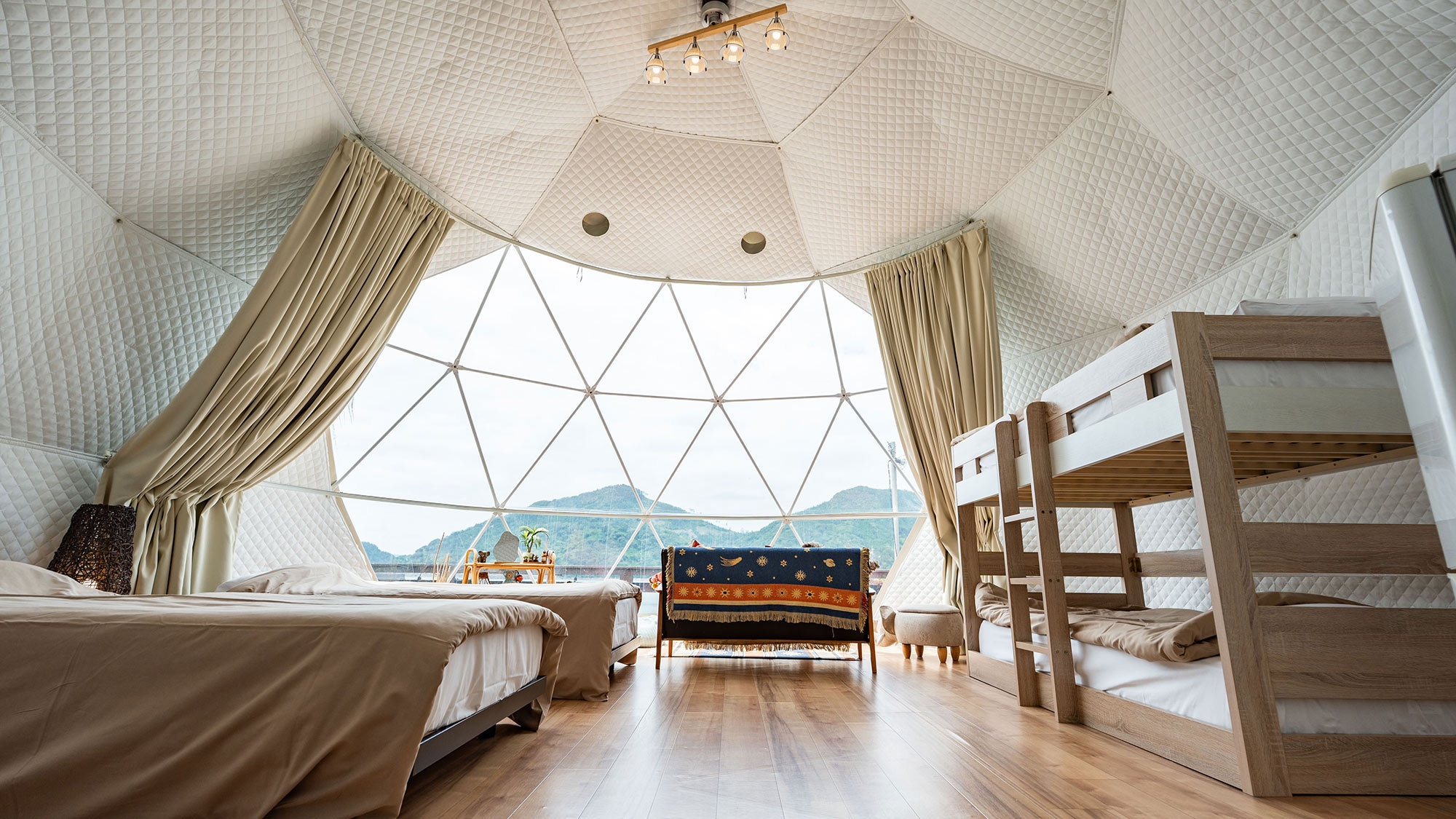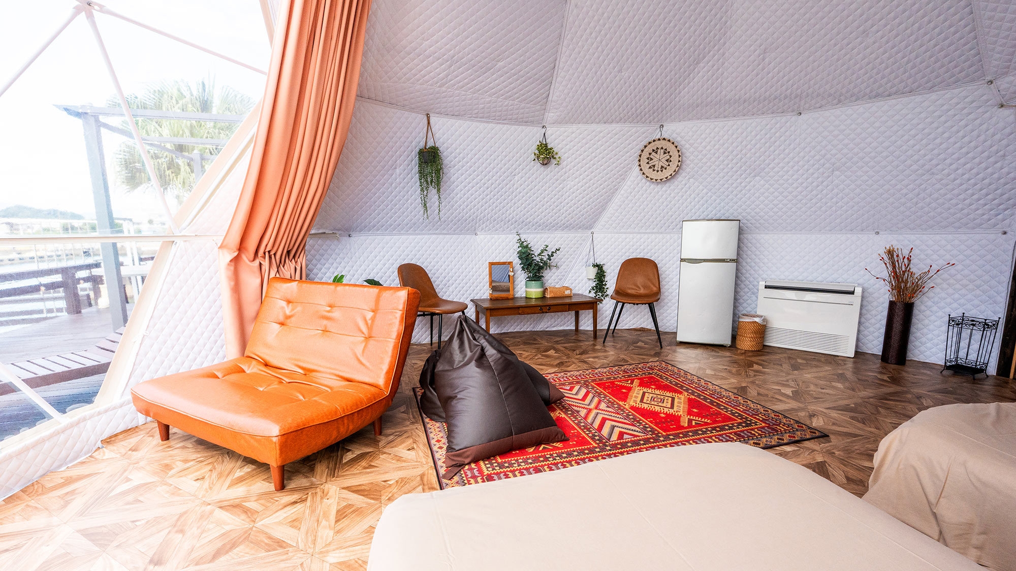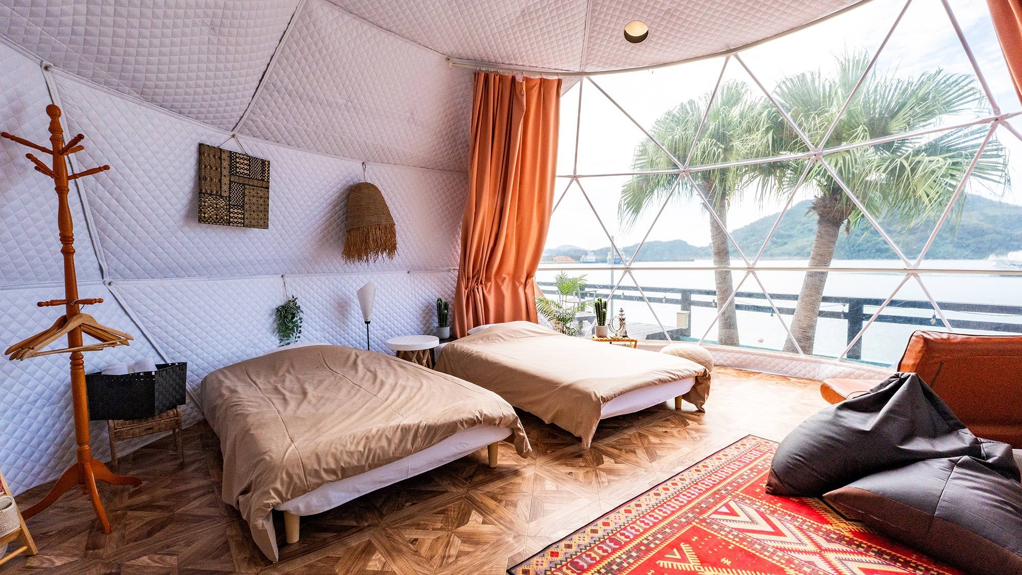 静かな時間を明るいテントで楽しむドームテント ○北欧風デザインのオーシャンビュードームテントでゆったりと“静か”な時間を※テント内にバス・トイレはございません
