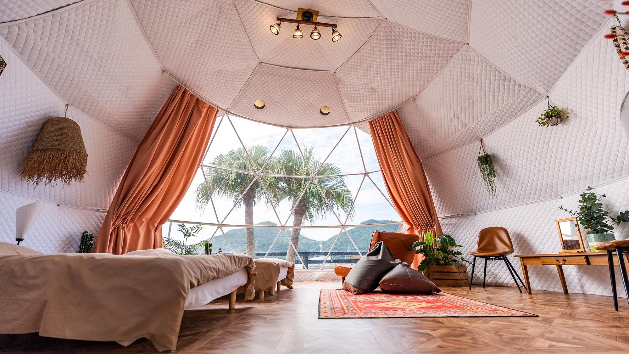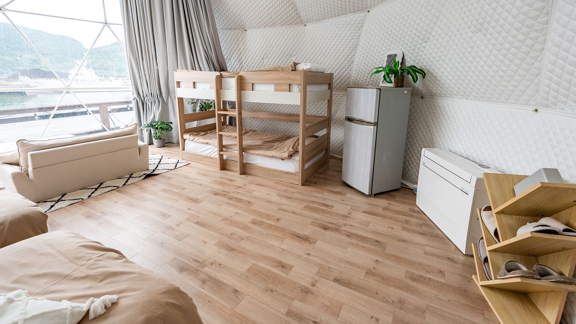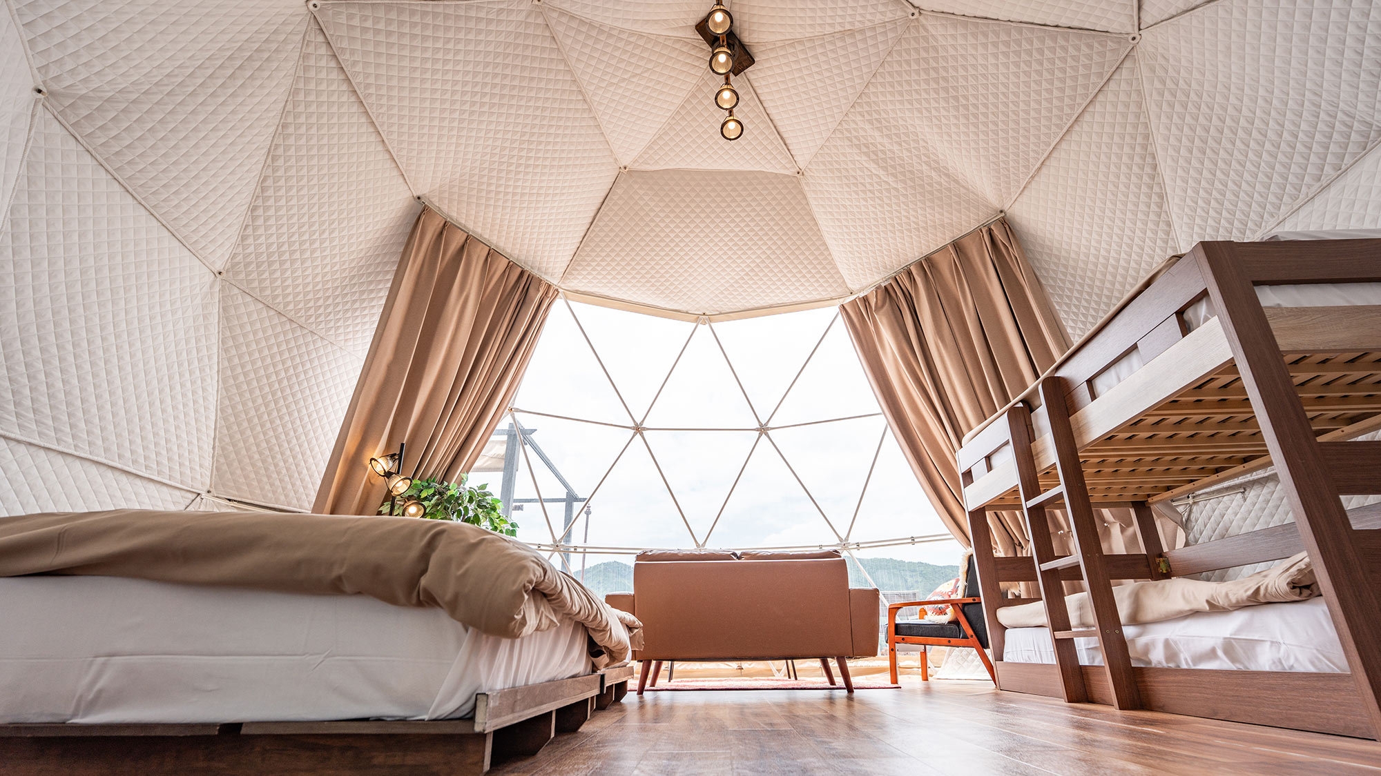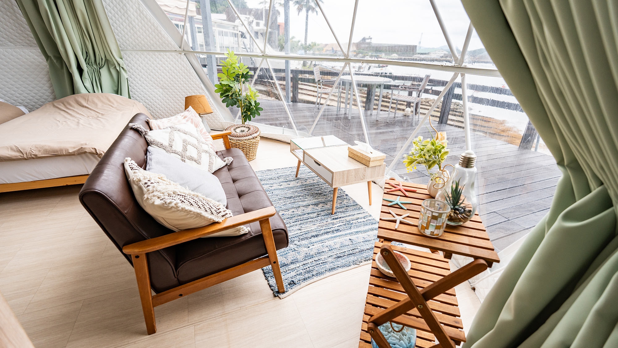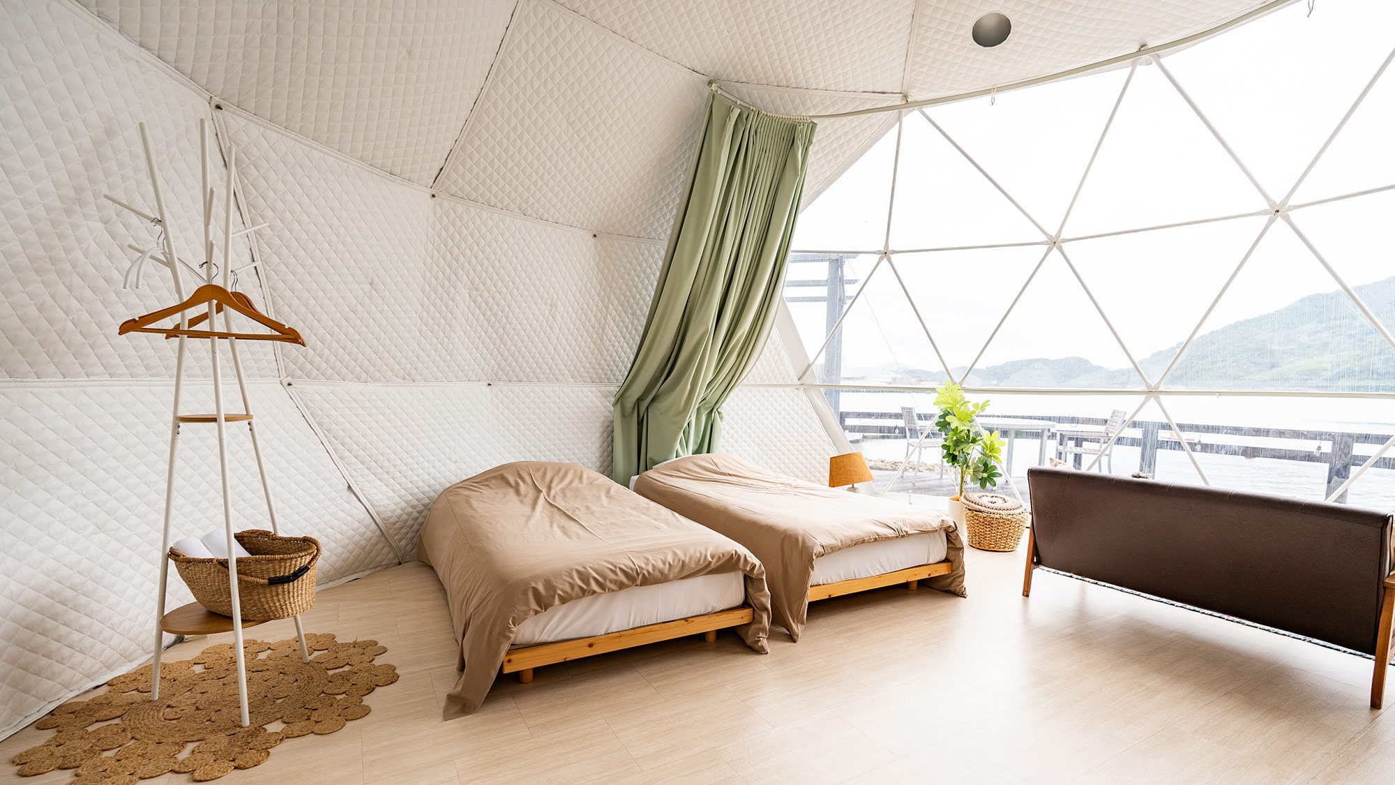 静かな時間を明るいテントで楽しむドームテント ○北欧風デザインのオーシャンビュードームテントでゆったりと“静か”な時間を※テント内にバス・トイレはございません
