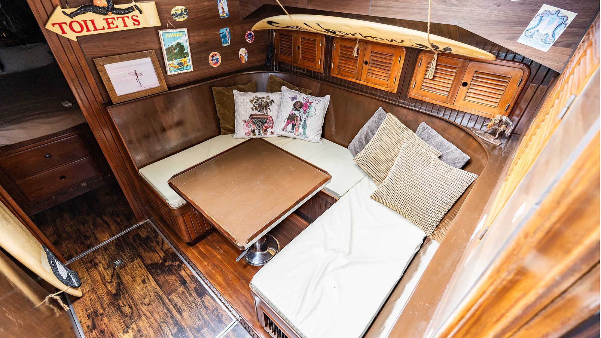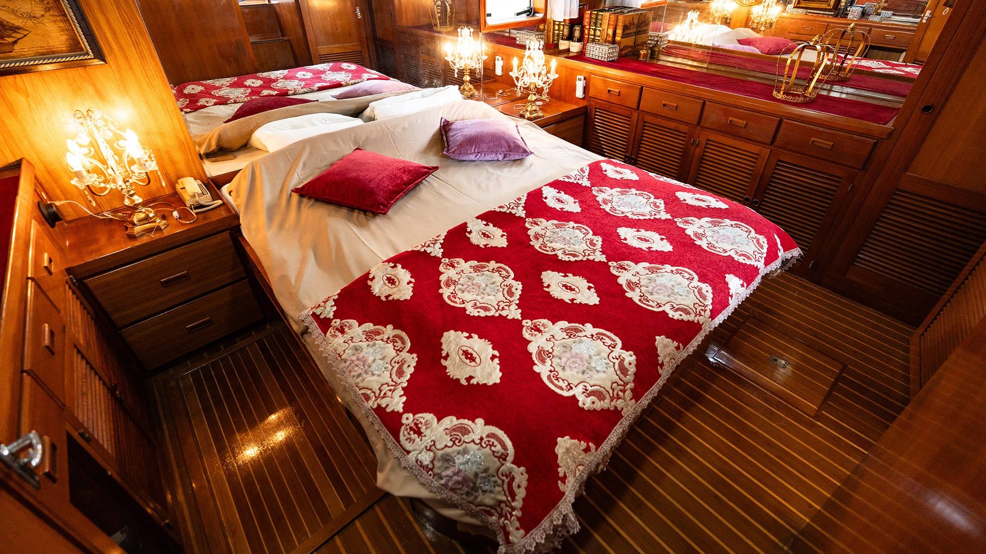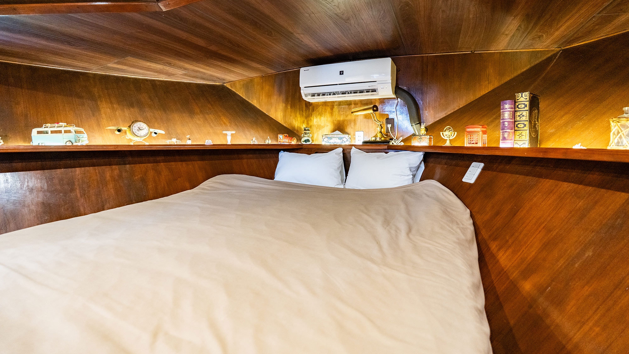 陸上にある揺れないクルーザーで非日常○実際のクルーザーを改装し、大人の方でも楽しめる室内※トイレ・シャワー付き、お風呂は大浴場でのご利用となります。