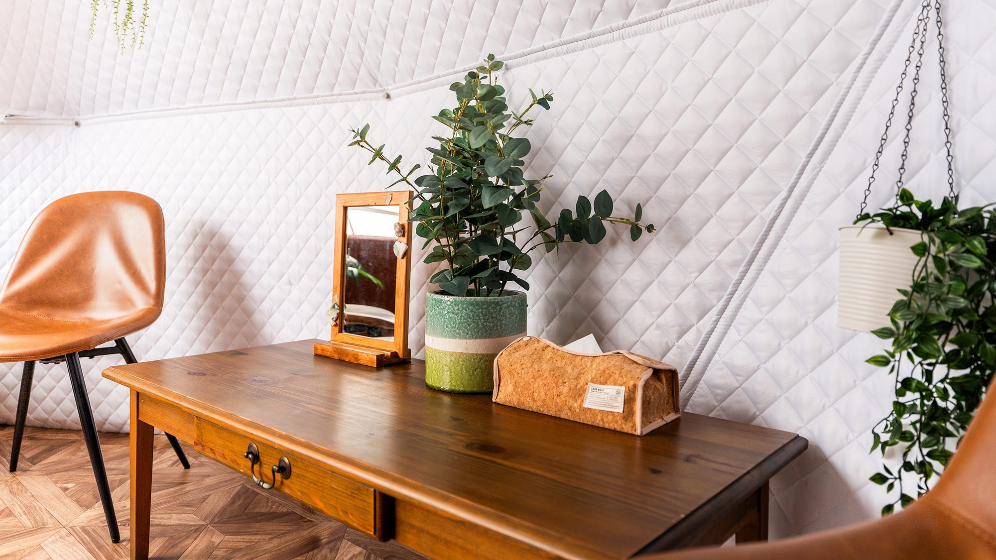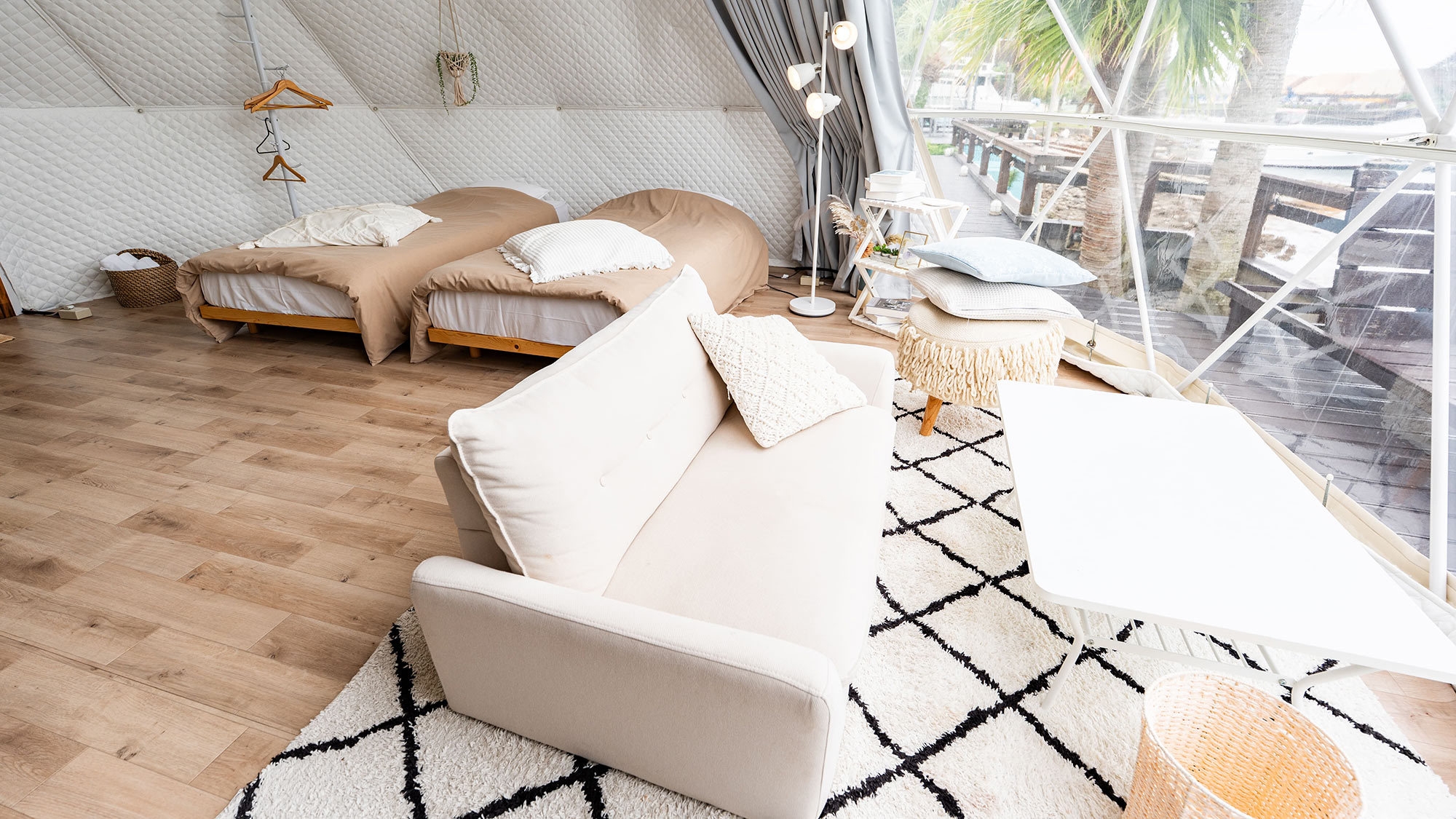 静かな時間を明るいテントで楽しむドームテント○ホワイトとグレーを基調とした優しい雰囲気と 可愛い小物に癒される非日常を※テント内にバス・トイレはございません