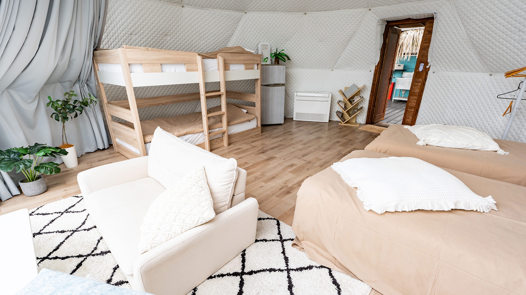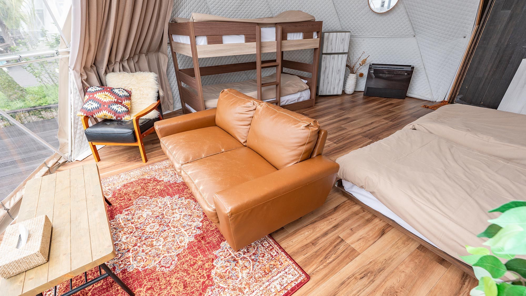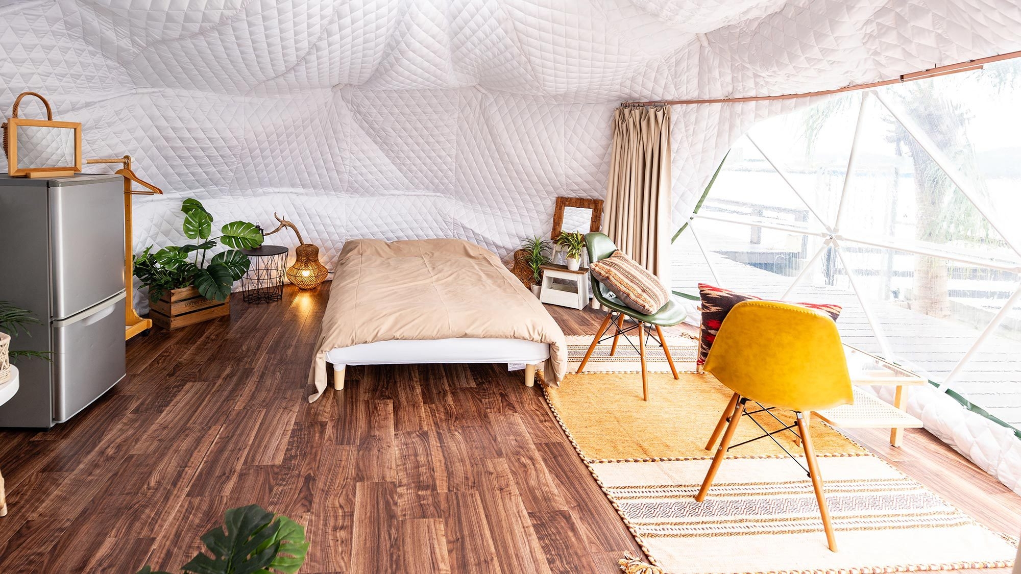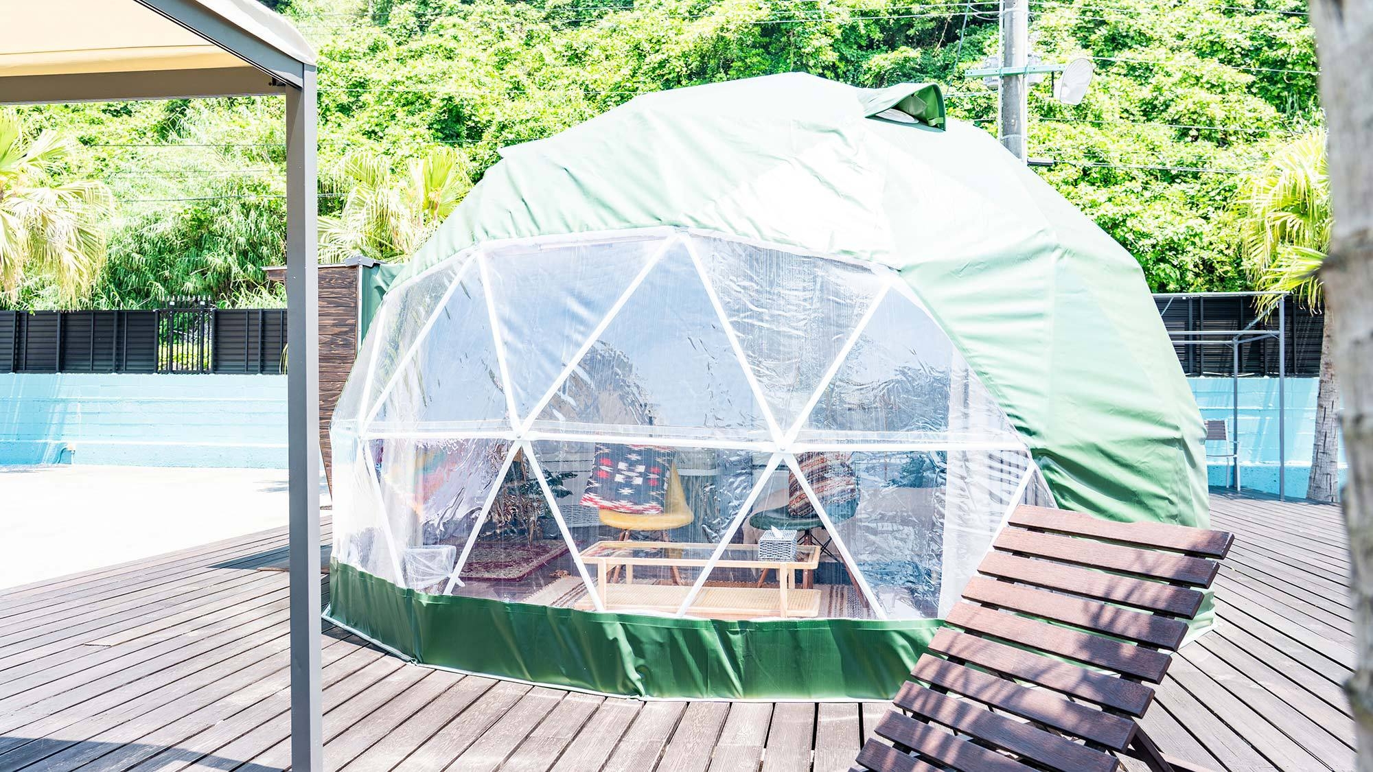 静かな時間を明るいテントで楽しむドームテント ○自然や海を近くに感じられる雰囲気をまとったお部屋※テント内にバス・トイレはございません