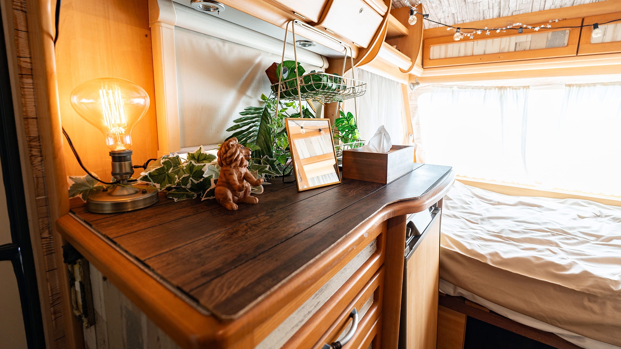 海のすぐ横にあるキャンピングカーで非日常体験○外観はマオリ文化の象徴である鳥や亜熱帯の花と歌や踊りがモチーフ ※トイレ・お風呂はついておりません