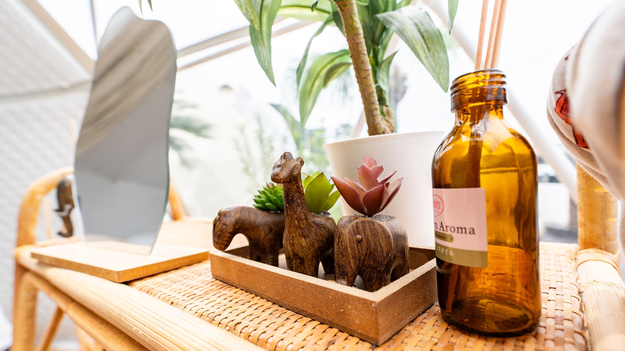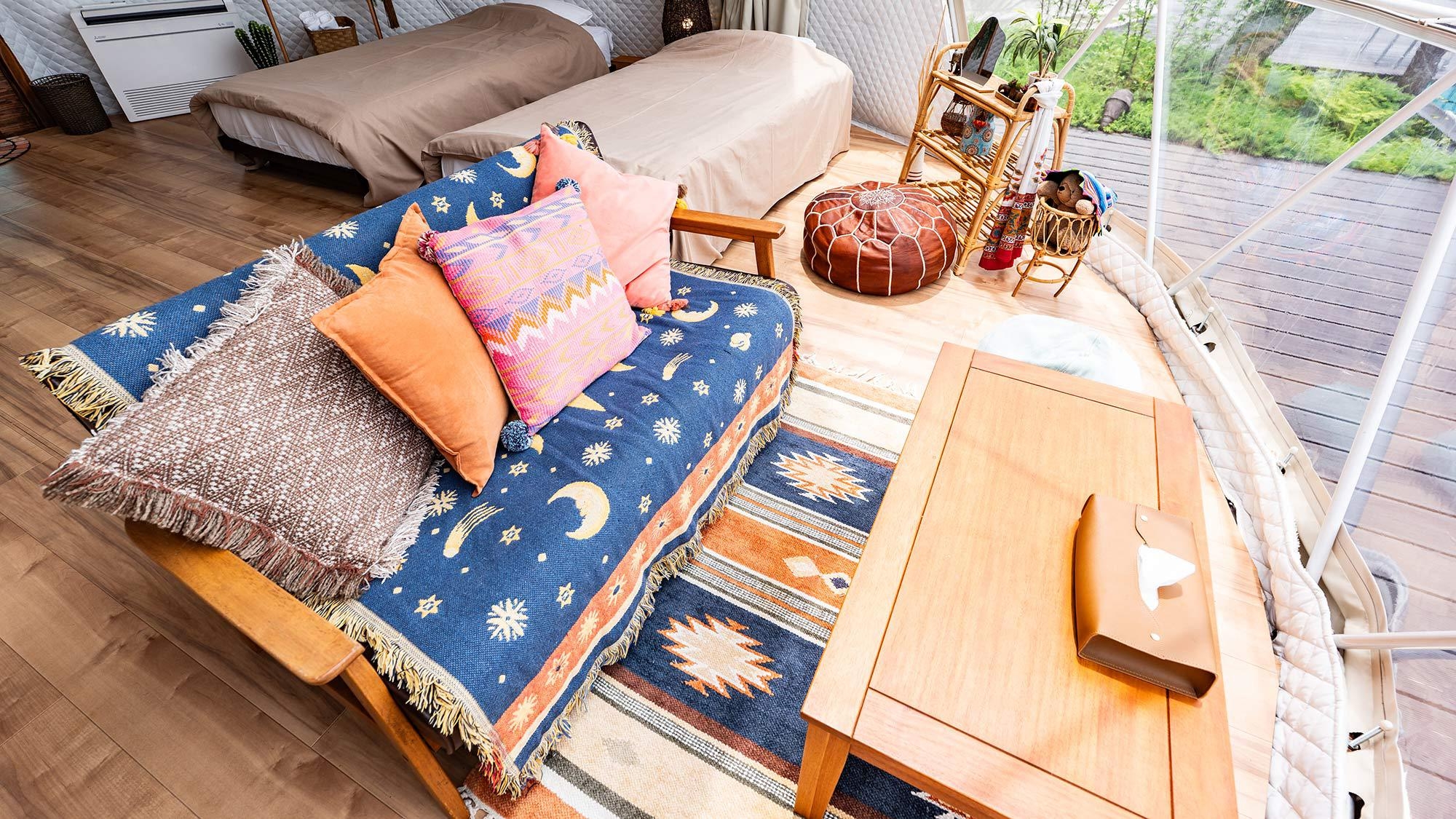 静かな時間を明るいテントで楽しむドームテント ○アジアンな雰囲気をまとった小物が散りばめられ、異国情緒漂う雰囲気を♪※テント内にバス・トイレはございません