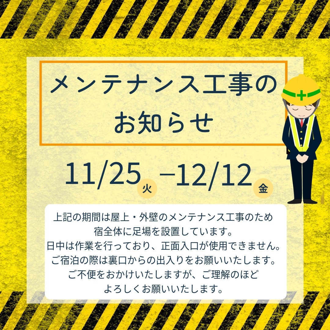 屋上および外壁のメンテナンス工事を行っております。建物全体に足場を設置し、日中は作業があります。正面入口が使えないため裏口からお入りください。