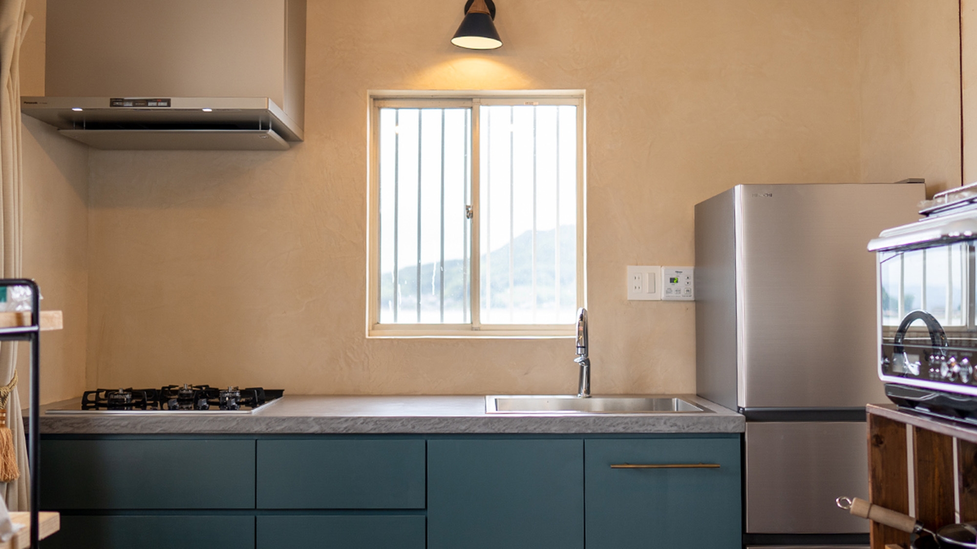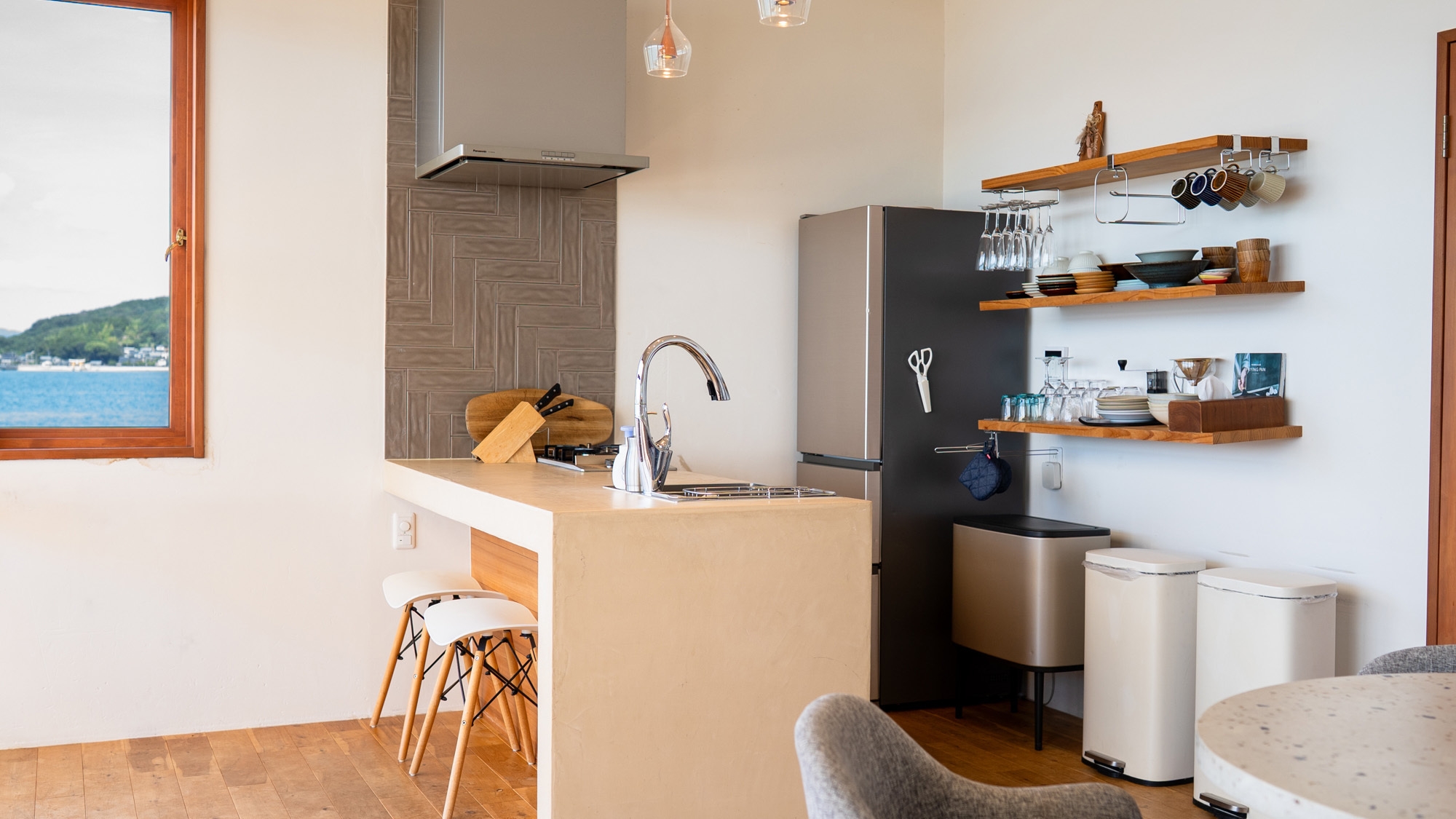 アウトドア志向型の一棟貸切棟で、ナチュラルなイメージで統一したリビング&キッチンの備わったお部屋。釣具、シネマセット、BBQセットなど、様々なツールをご用意