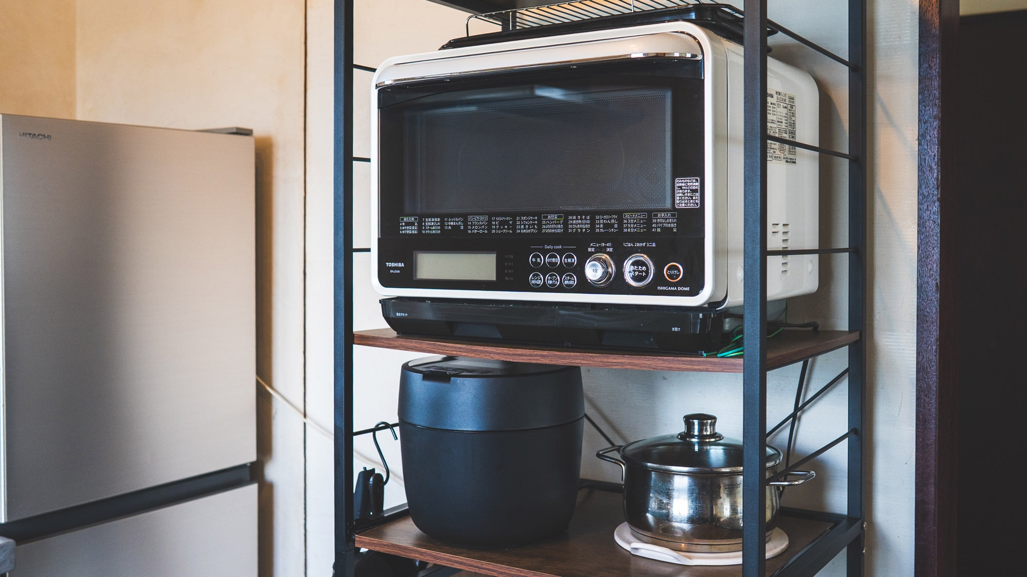 オーブンレンジ、湯沸かしポット、コーヒードリッパー、調理器具一式、食器類