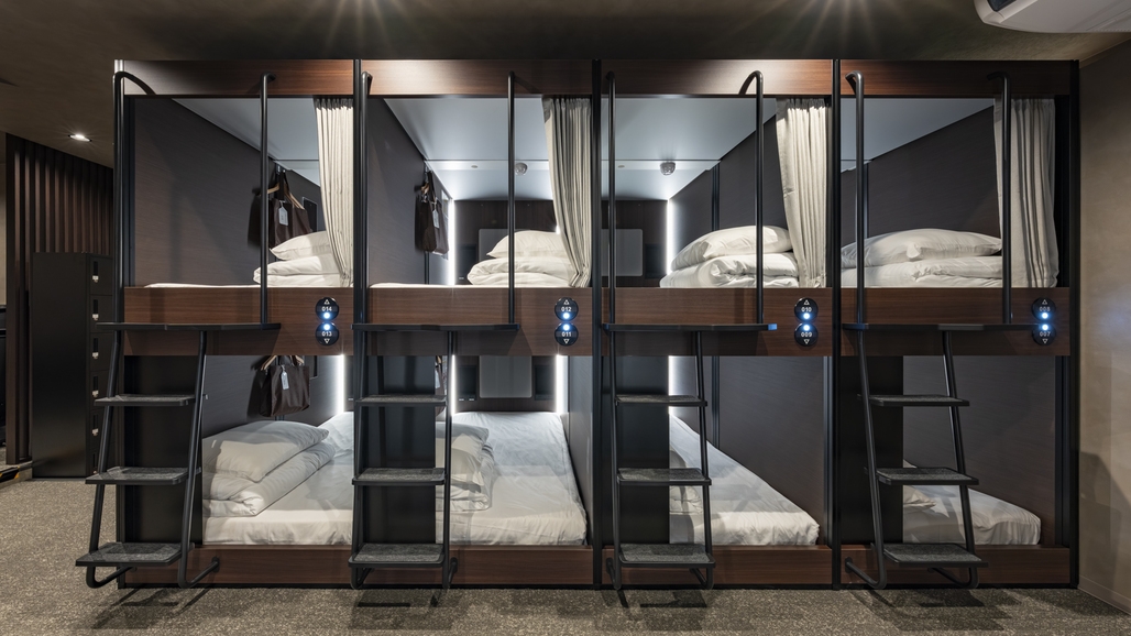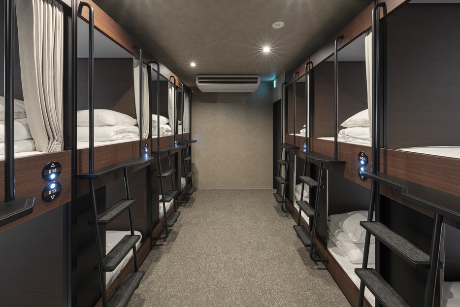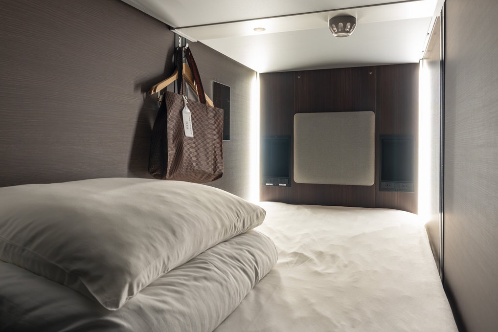 シングルベッドサイズのカプセルルーム(男性専用)。各室にタオルセットや電源・ハンガーあります。冷蔵庫・テレビはありません。トイレやシャワーは共用です。