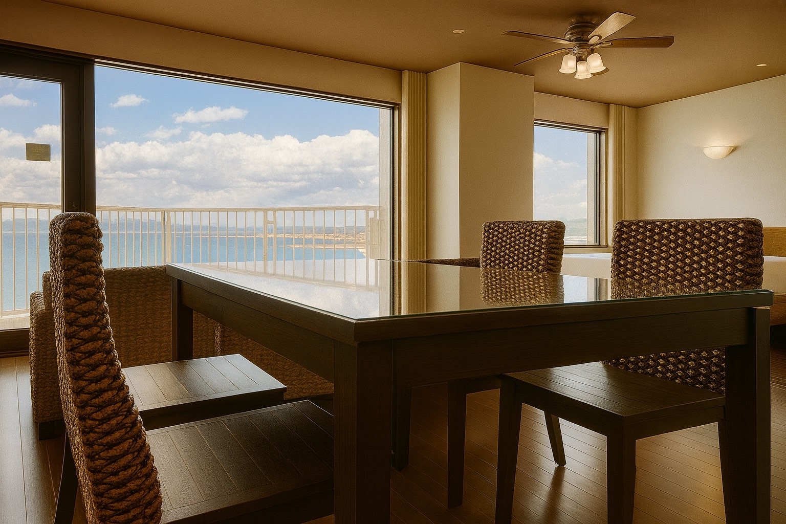 和洋室合わせて86.3平米のスイートルーム。オーシャンビュー! ※こちらのお部屋にはお風呂はございませんので、3階の海または庭園の見える貸切風呂をご利用下さい